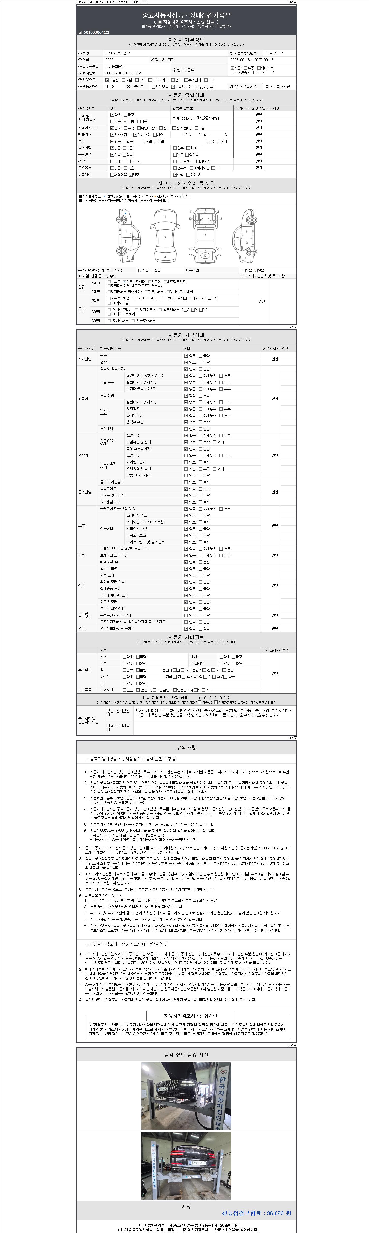 | 주행거리 | 74,294 km | 차량번호 | 128두3157 | 사고유무 | 성능기록부 참조 | 제시번호 | 제 2147483647 호 |