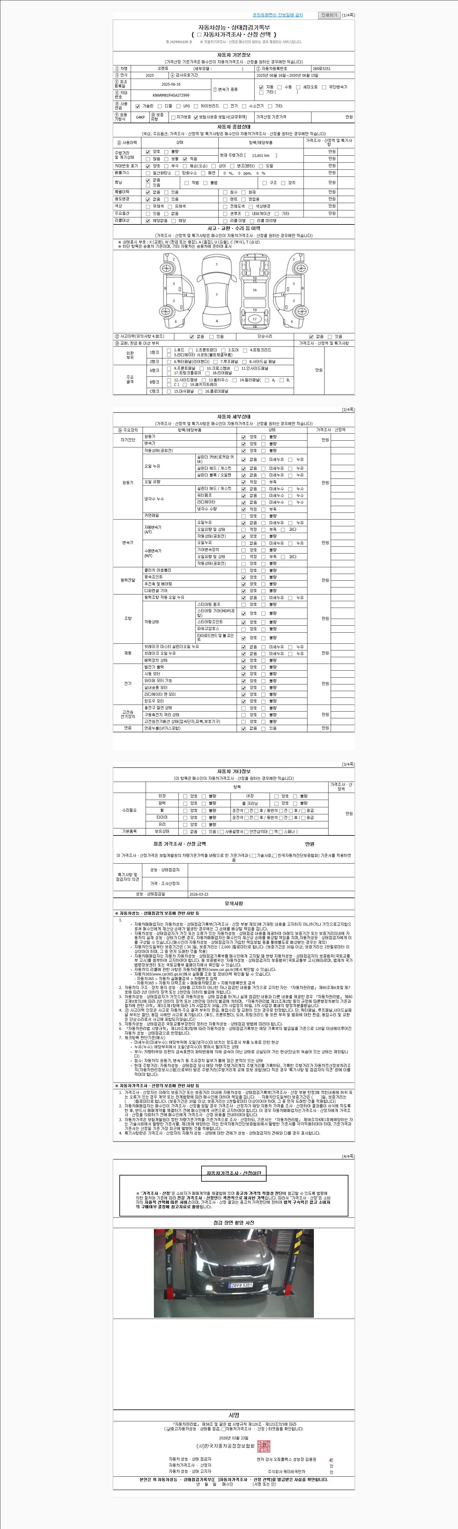 | 주행거리 | 13,601 km | 차량번호 | 289로5351 | 사고유무 | 성능기록부 참조 | 제시번호 | 제 2026036805 호 |