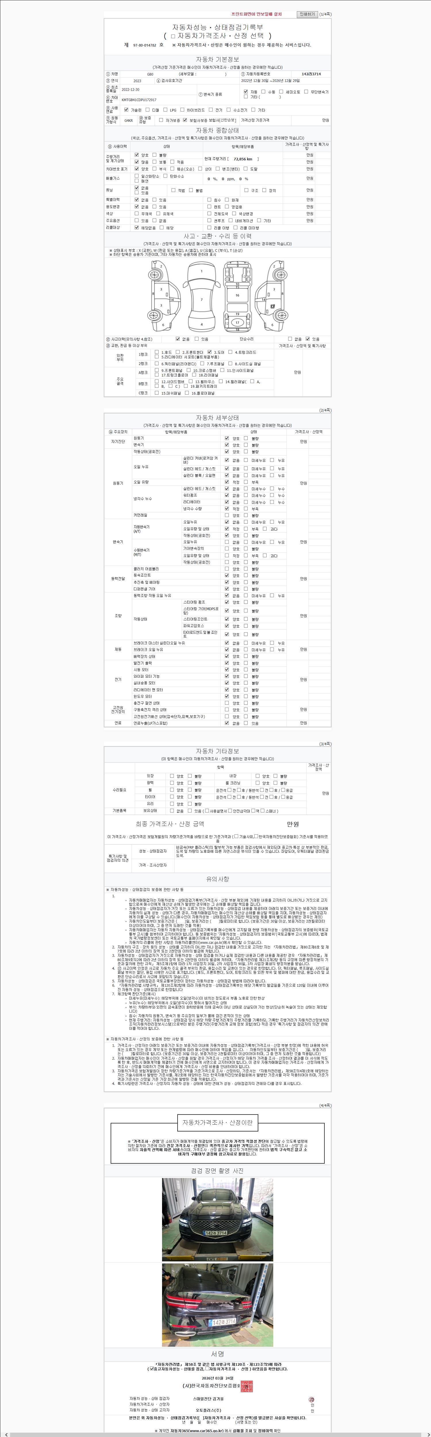 | 주행거리 | 72,856 km | 차량번호 | 142라3714 | 사고유무 | 성능기록부 참조 | 제시번호 | 제 2026009500 호 |