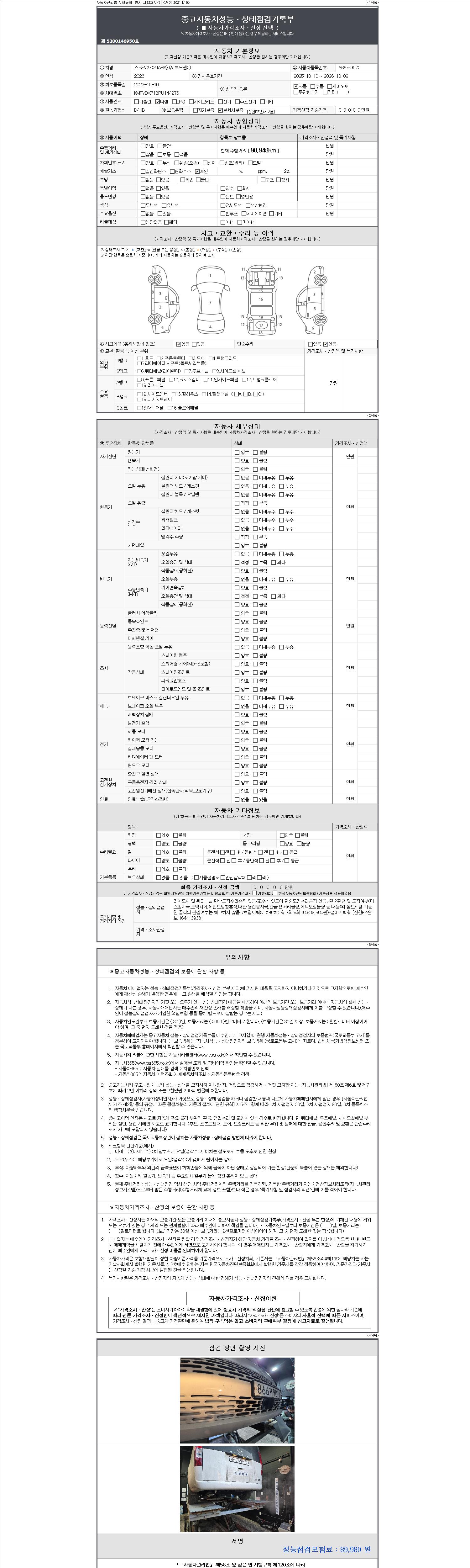 자동차관리법 시행규칙 제120조의 규정에 따라 별지 제 82호서식 《중고자동차 성능, 상태점검 기록부》를 발행한 성능, 상태점검자 및 매매자는 아래의 보증기간 또는 보증거리 이내의 중고자동차, 성능점검 기록부에 기재된 내용과 자동차의 실제 성능, 상태가 다른 경우 계약 또는 관계법령에 따라 매수인에 대하여 책임을 집니다.