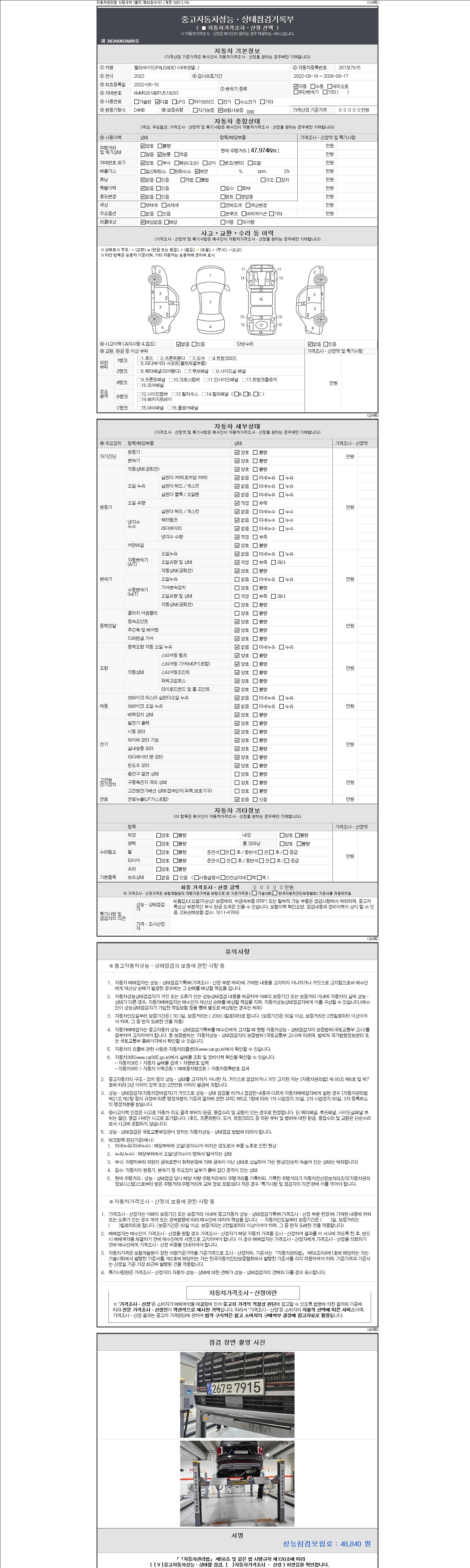 자동차관리법 시행규칙 제120조의 규정에 따라 별지 제 82호서식 《중고자동차 성능, 상태점검 기록부》를 발행한 성능, 상태점검자 및 매매자는 아래의 보증기간 또는 보증거리 이내의 중고자동차, 성능점검 기록부에 기재된 내용과 자동차의 실제 성능, 상태가 다른 경우 계약 또는 관계법령에 따라 매수인에 대하여 책임을 집니다.