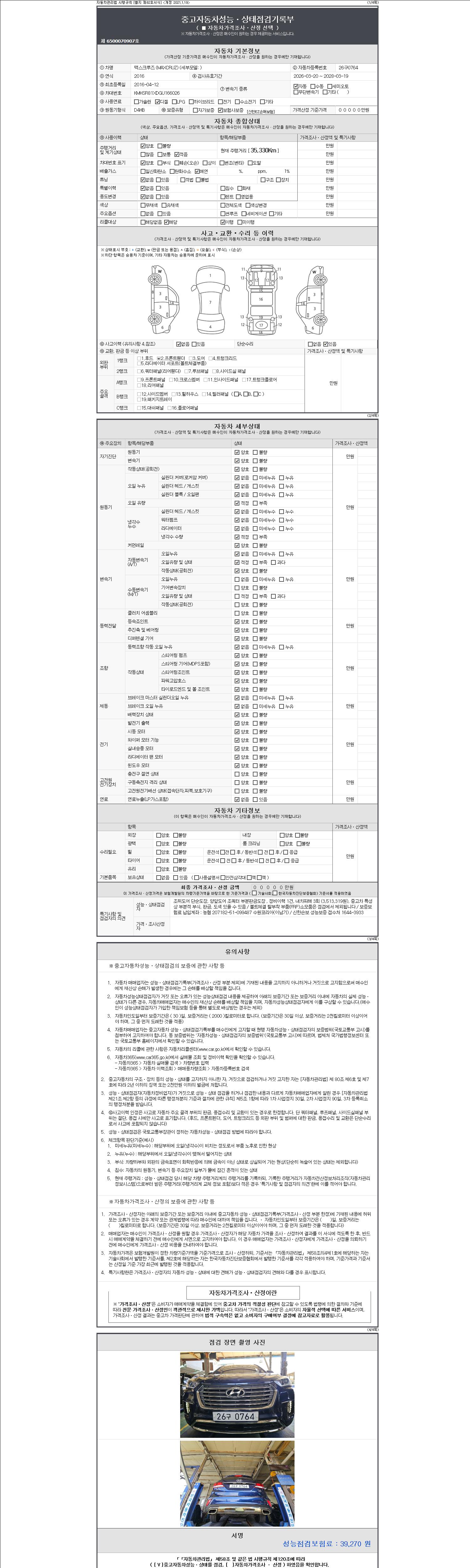 | 주행거리 | 35,313 km | 차량번호 | 26구0764 | 사고유무 | 성능기록부 참조 | 제시번호 | 제 2147483647 호 |