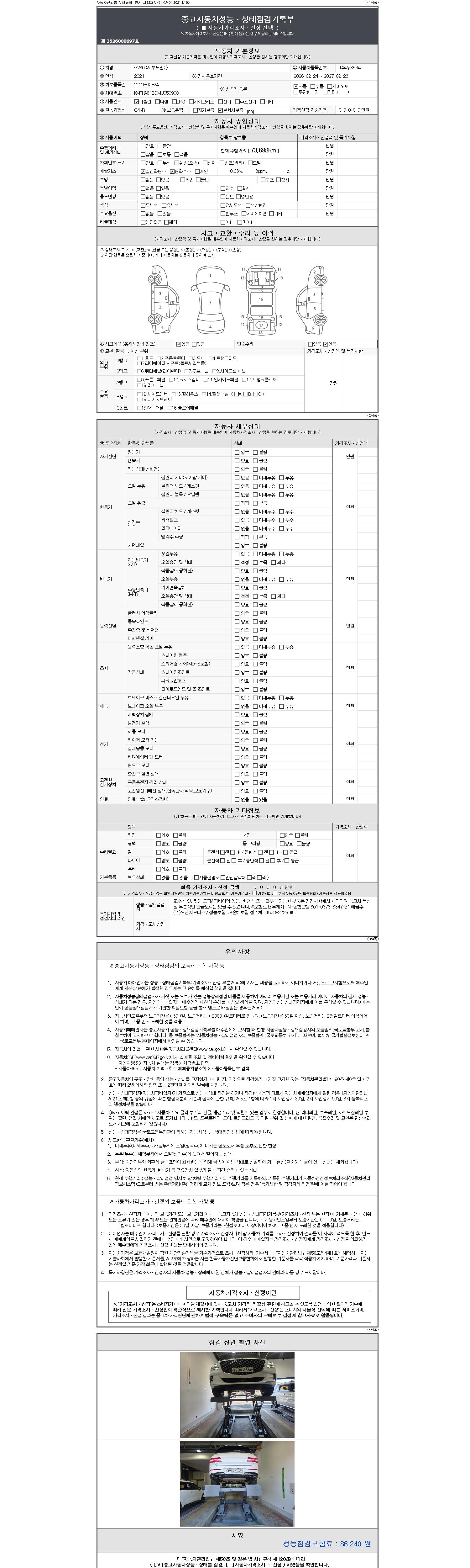 | 주행거리 | 73,698 km | 차량번호 | 144무8534 | 사고유무 | 성능기록부 참조 | 제시번호 | 제 2147483647 호 |