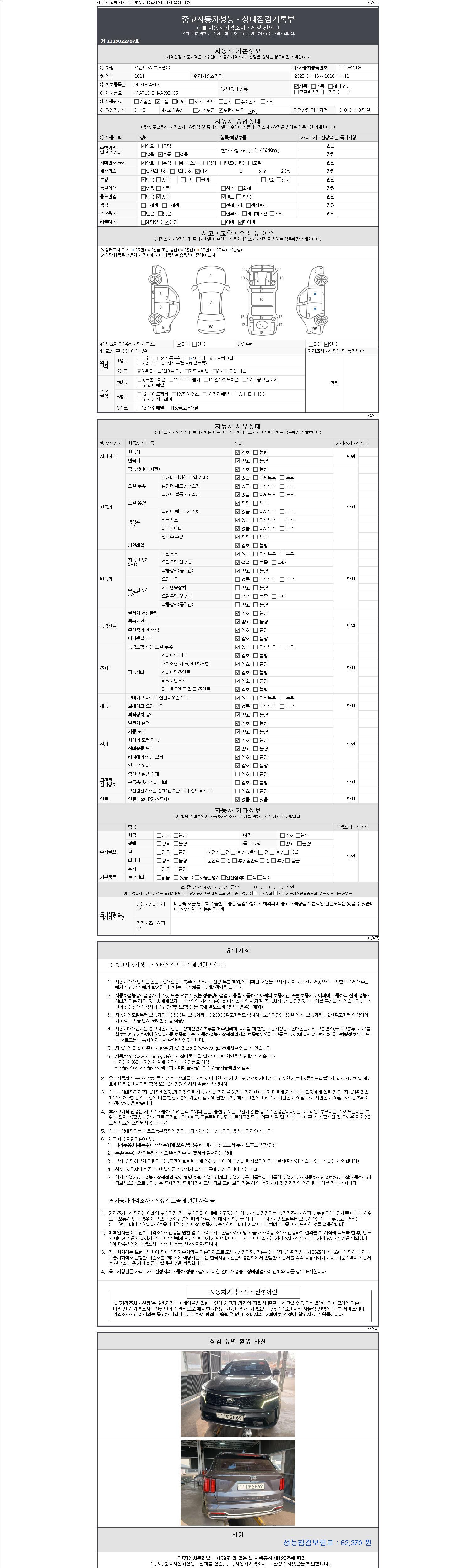 | 주행거리 | 53,462 km | 차량번호 | 111도2869 | 사고유무 | 성능기록부 참조 | 제시번호 | 제 2147483647 호 |
