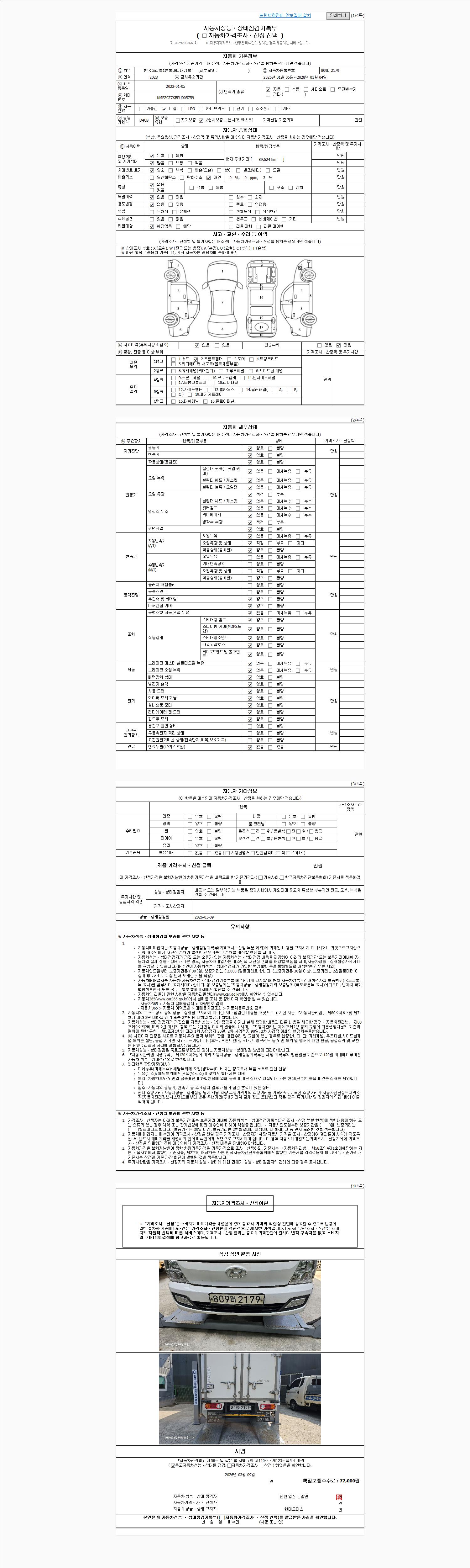 | 주행거리 | 89,624 km | 차량번호 | 809머2179 | 사고유무 | 성능기록부 참조 | 제시번호 | 제 2026011983 호 |