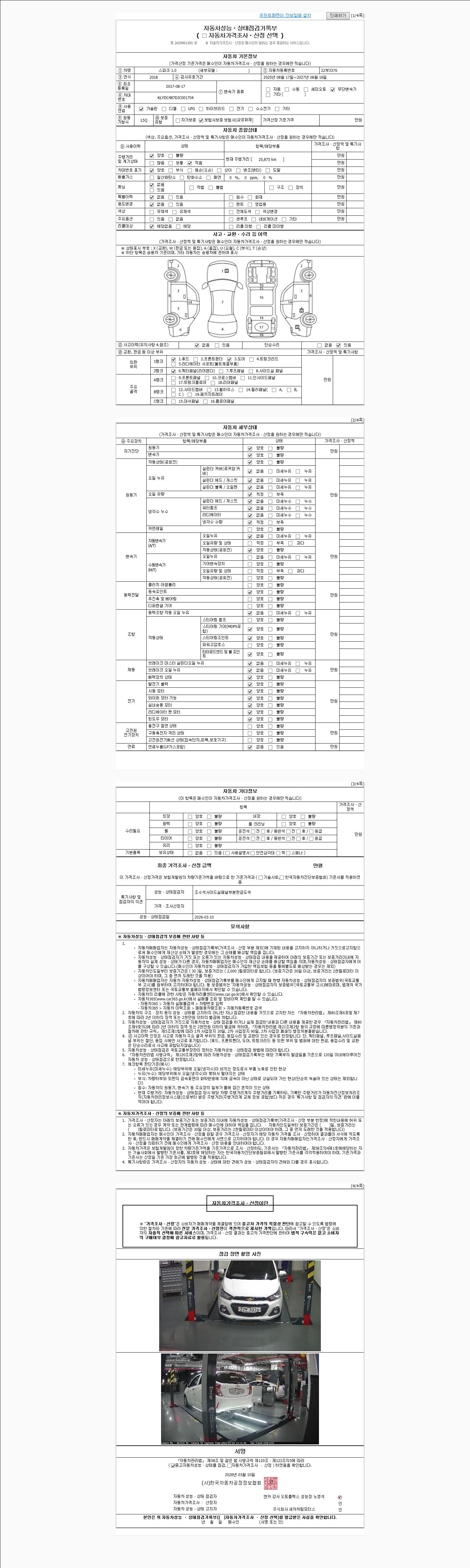 | 주행거리 | 25,875 km | 차량번호 | 22부3376 | 사고유무 | 성능기록부 참조 | 제시번호 | 제 2026030555 호 |