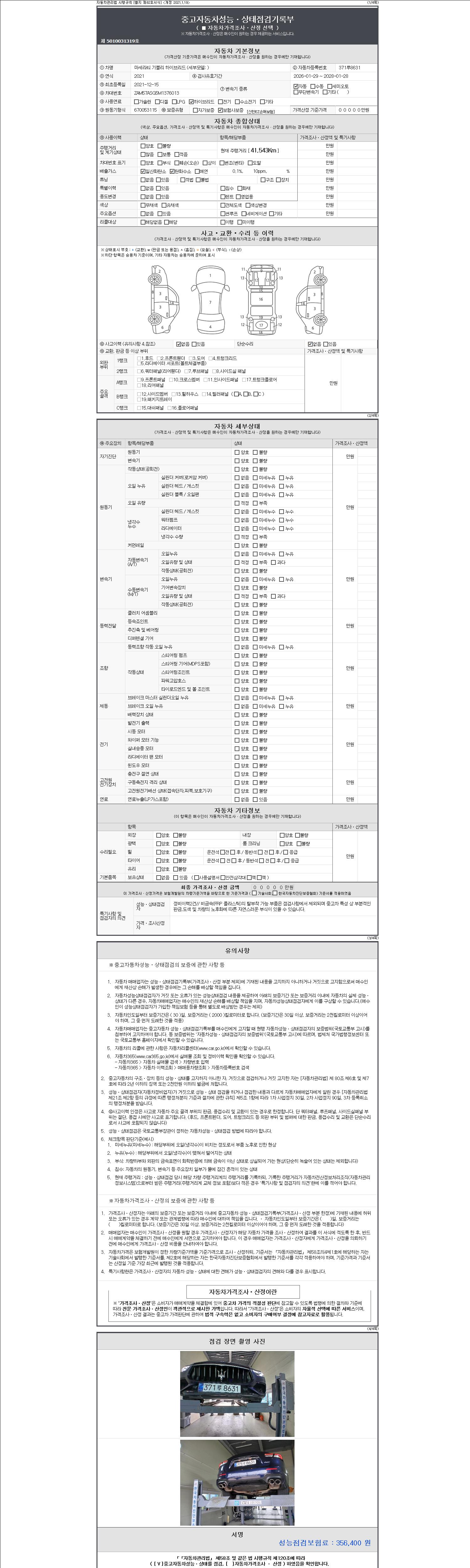 | 주행거리 | 41,529 km | 차량번호 | 371루8631 | 사고유무 | 성능기록부 참조 | 제시번호 | 제 2147483647 호 |