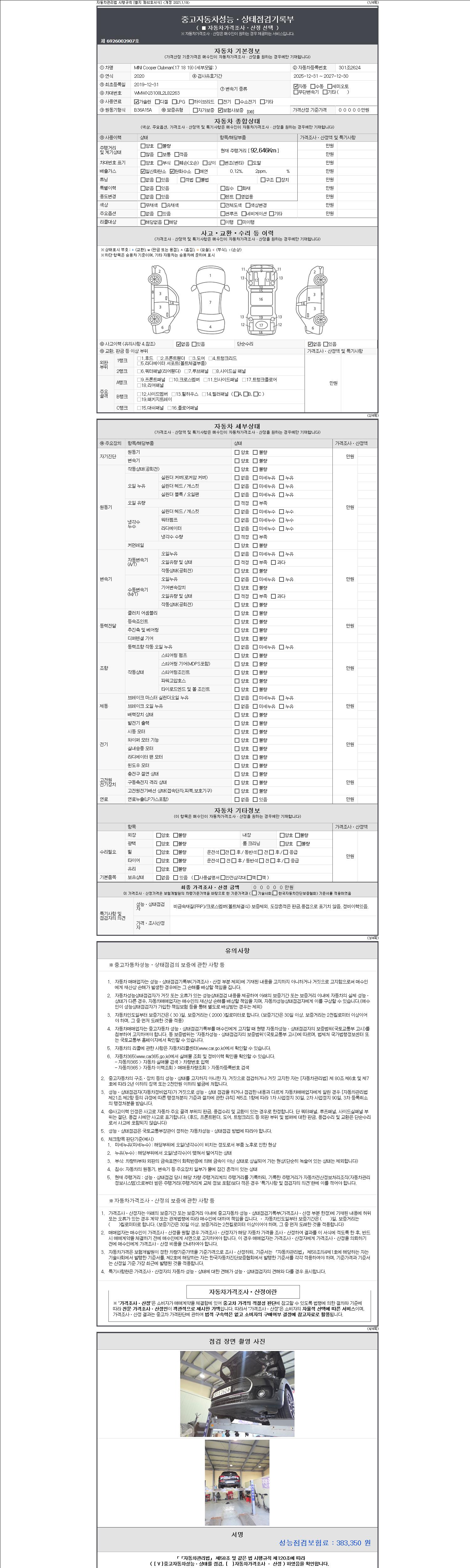자동차관리법 시행규칙 제120조의 규정에 따라 별지 제 82호서식 《중고자동차 성능, 상태점검 기록부》를 발행한 성능, 상태점검자 및 매매자는 아래의 보증기간 또는 보증거리 이내의 중고자동차, 성능점검 기록부에 기재된 내용과 자동차의 실제 성능, 상태가 다른 경우 계약 또는 관계법령에 따라 매수인에 대하여 책임을 집니다.
