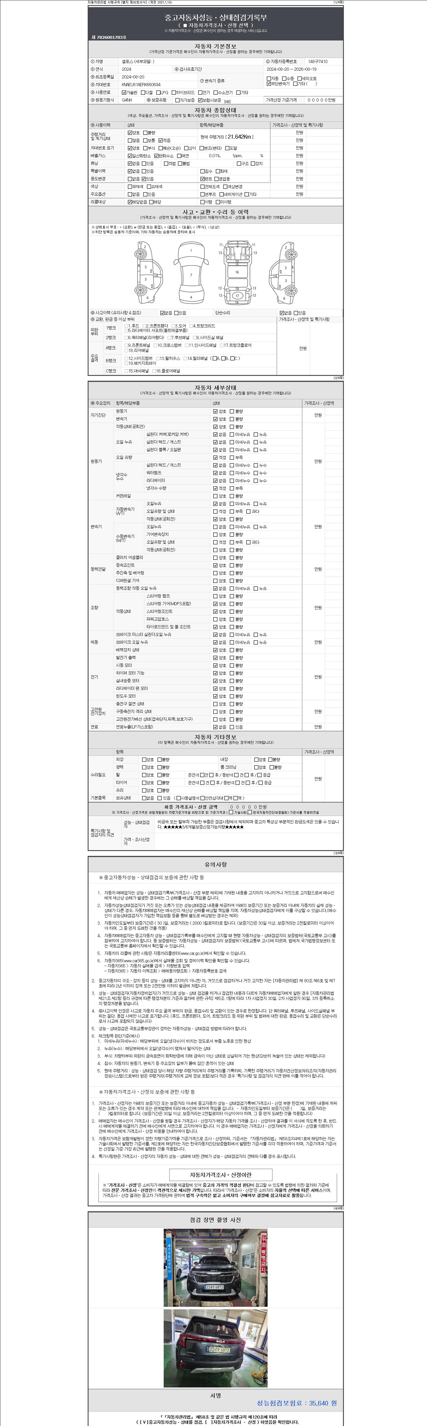 자동차관리법 시행규칙 제120조의 규정에 따라 별지 제 82호서식 《중고자동차 성능, 상태점검 기록부》를 발행한 성능, 상태점검자 및 매매자는 아래의 보증기간 또는 보증거리 이내의 중고자동차, 성능점검 기록부에 기재된 내용과 자동차의 실제 성능, 상태가 다른 경우 계약 또는 관계법령에 따라 매수인에 대하여 책임을 집니다.