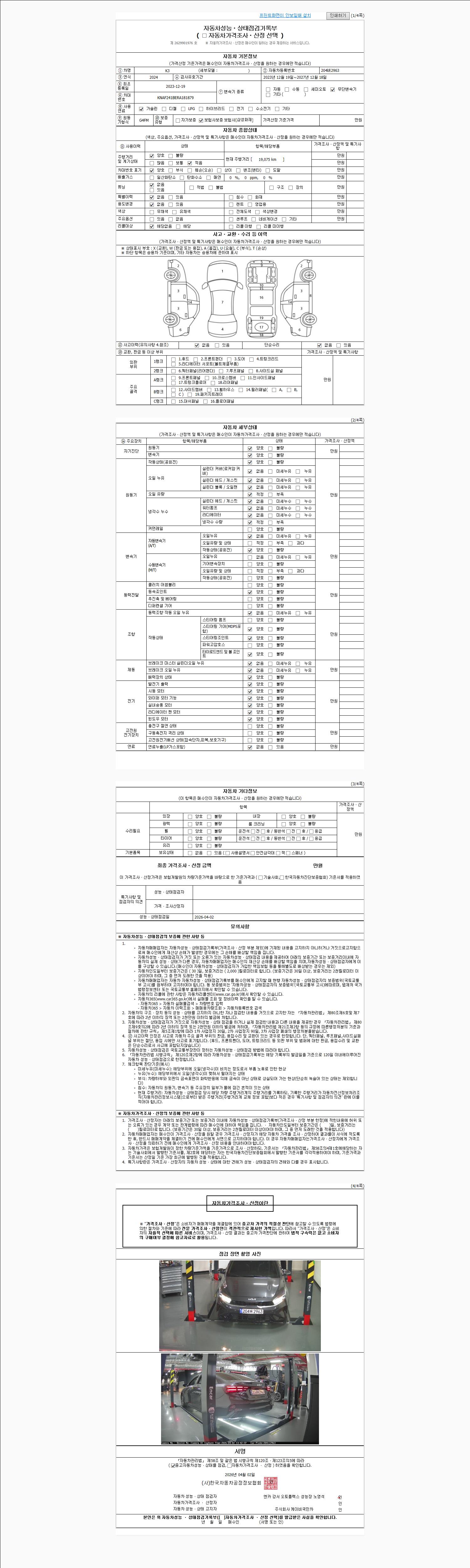 | 주행거리 | 19,075 km | 차량번호 | 204버2963 | 사고유무 | 성능기록부 참조 | 제시번호 | 제 2026042426 호 |