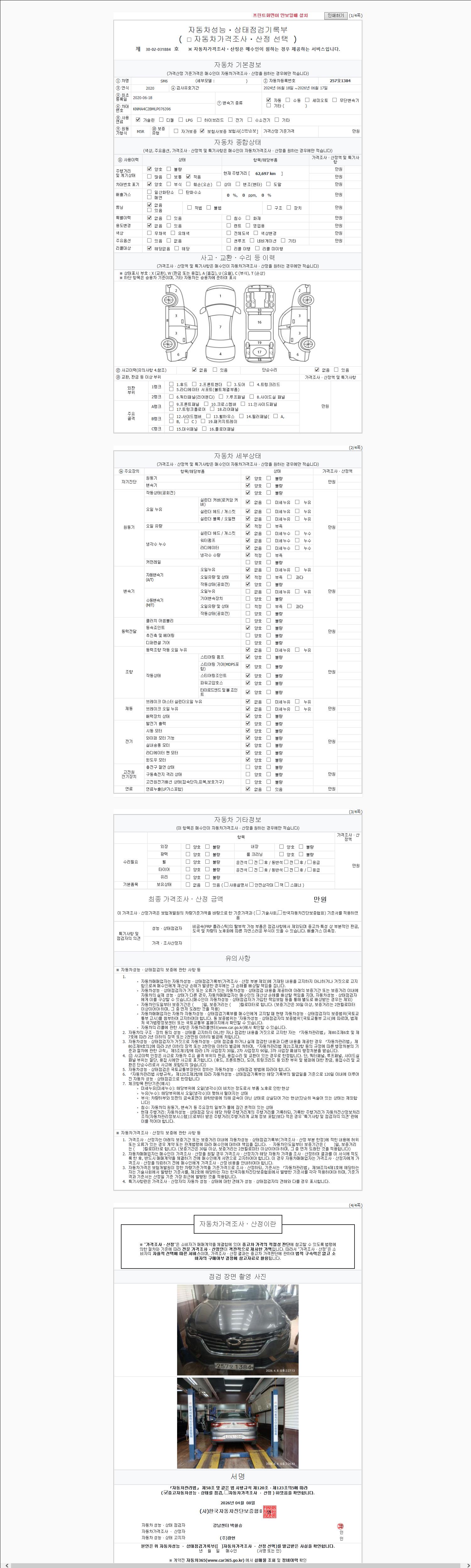 | 주행거리 | 62,697 km | 차량번호 | 257오1384 | 사고유무 | 성능기록부 참조 | 제시번호 | 제 2026045256 호 |