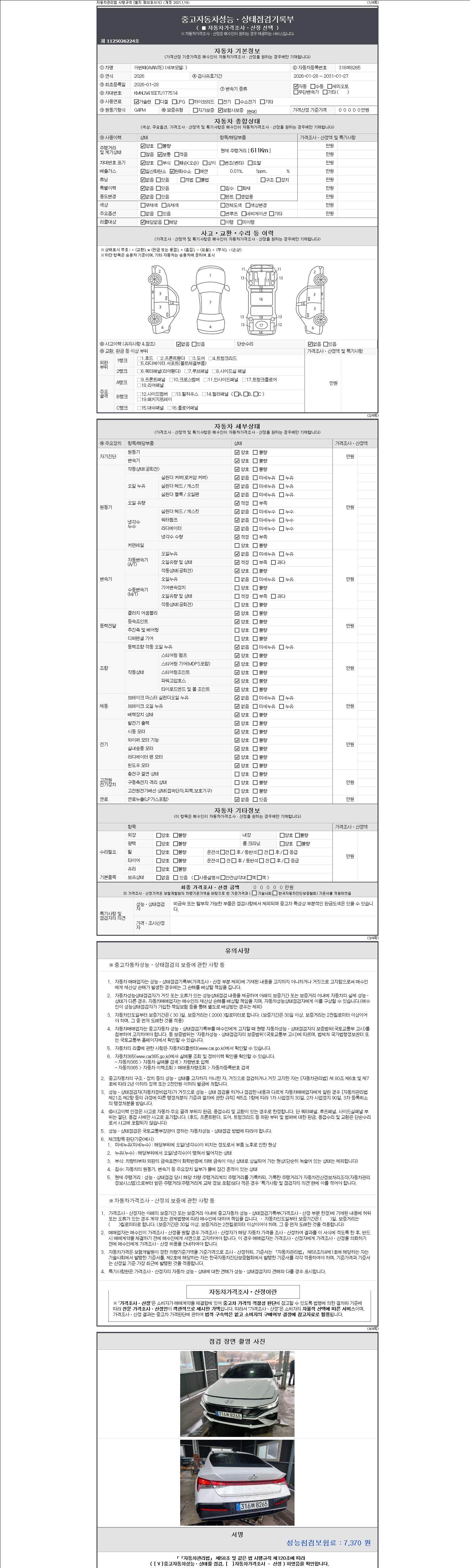 | 주행거리 | 611 km | 차량번호 | 316버8265 | 사고유무 | 성능기록부 참조 | 제시번호 | 제 2147483647 호 |