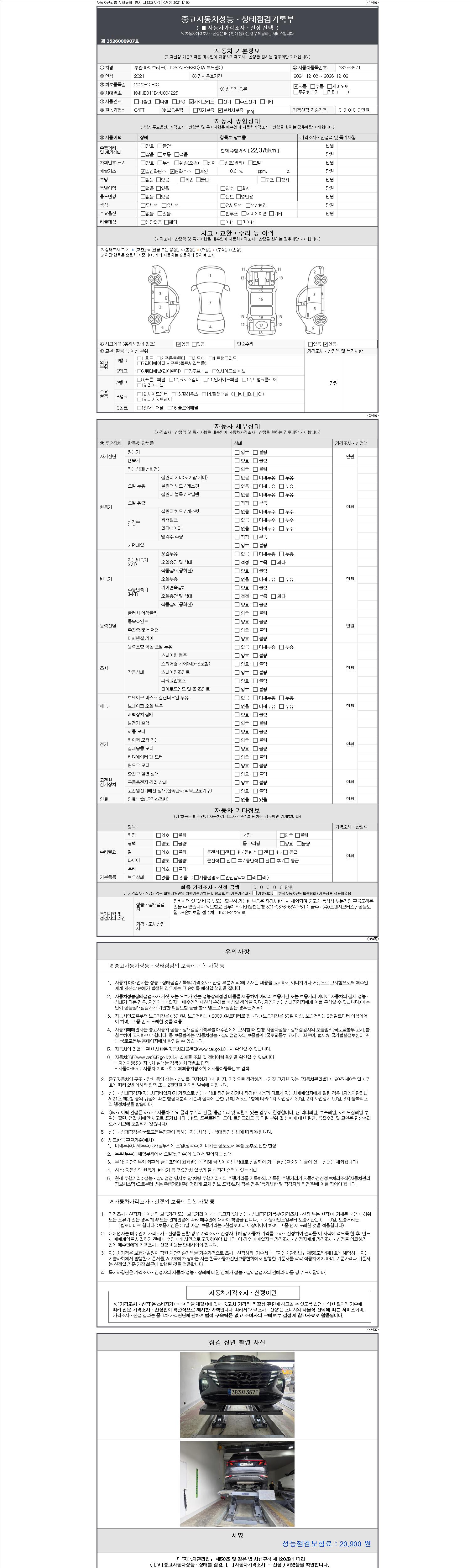 자동차관리법 시행규칙 제120조의 규정에 따라 별지 제 82호서식 《중고자동차 성능, 상태점검 기록부》를 발행한 성능, 상태점검자 및 매매자는 아래의 보증기간 또는 보증거리 이내의 중고자동차, 성능점검 기록부에 기재된 내용과 자동차의 실제 성능, 상태가 다른 경우 계약 또는 관계법령에 따라 매수인에 대하여 책임을 집니다.