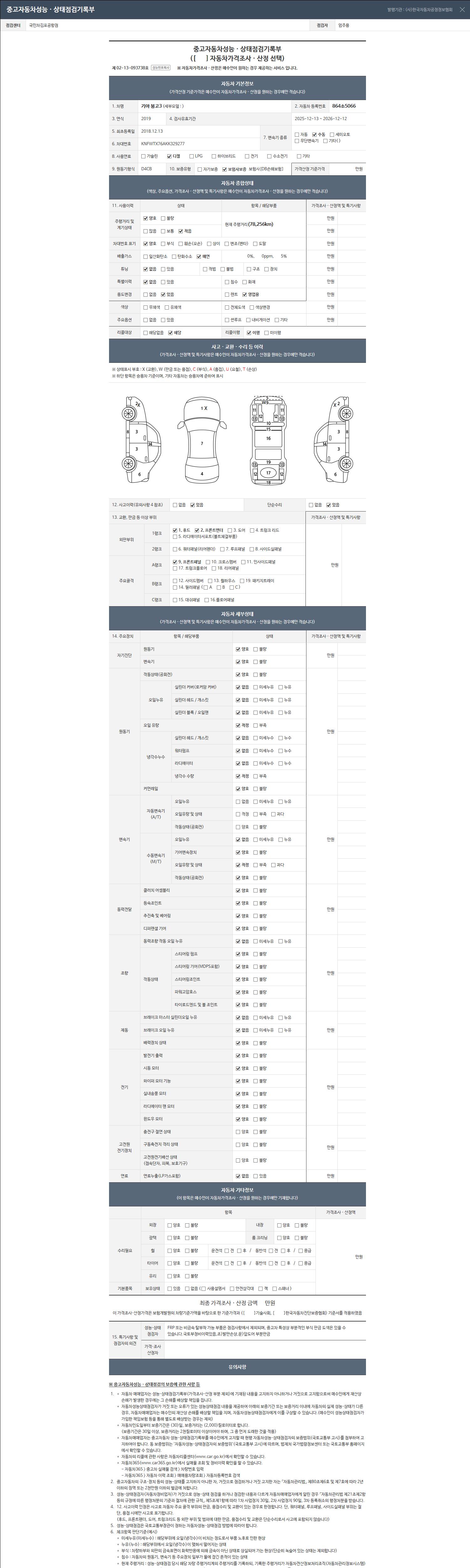 | 주행거리 | 78,256 km | 차량번호 | 864소5066 | 사고유무 | 성능기록부 참조 | 제시번호 | 제 2026053720 호 |