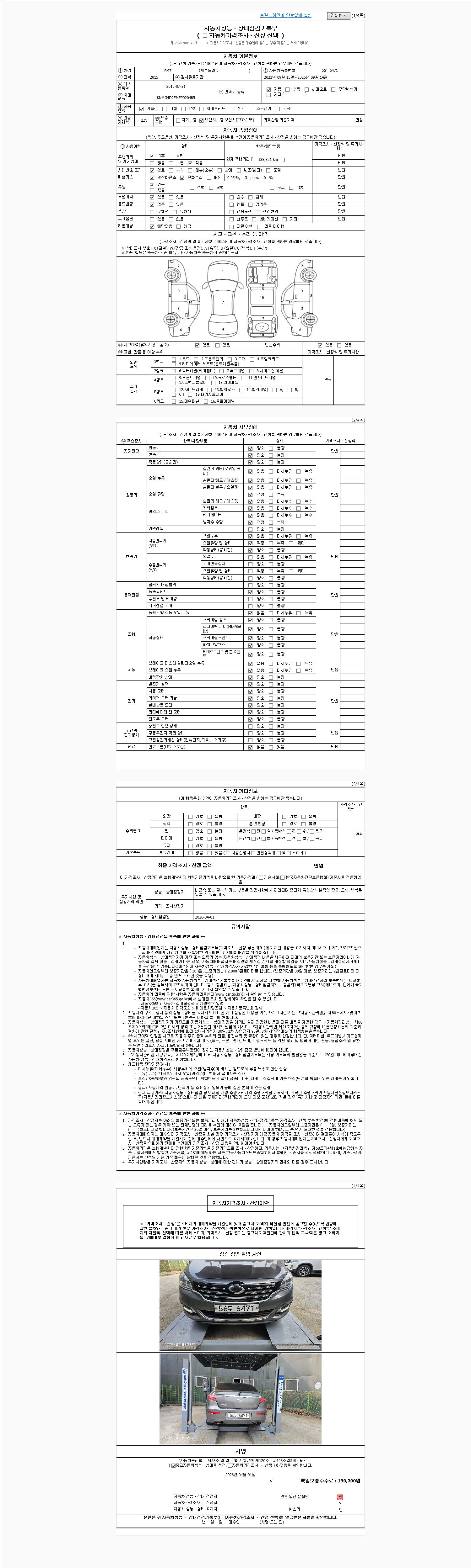 | 주행거리 | 138,321 km | 차량번호 | 56두6471 | 사고유무 | 성능기록부 참조 | 제시번호 | 제 2026014621 호 |