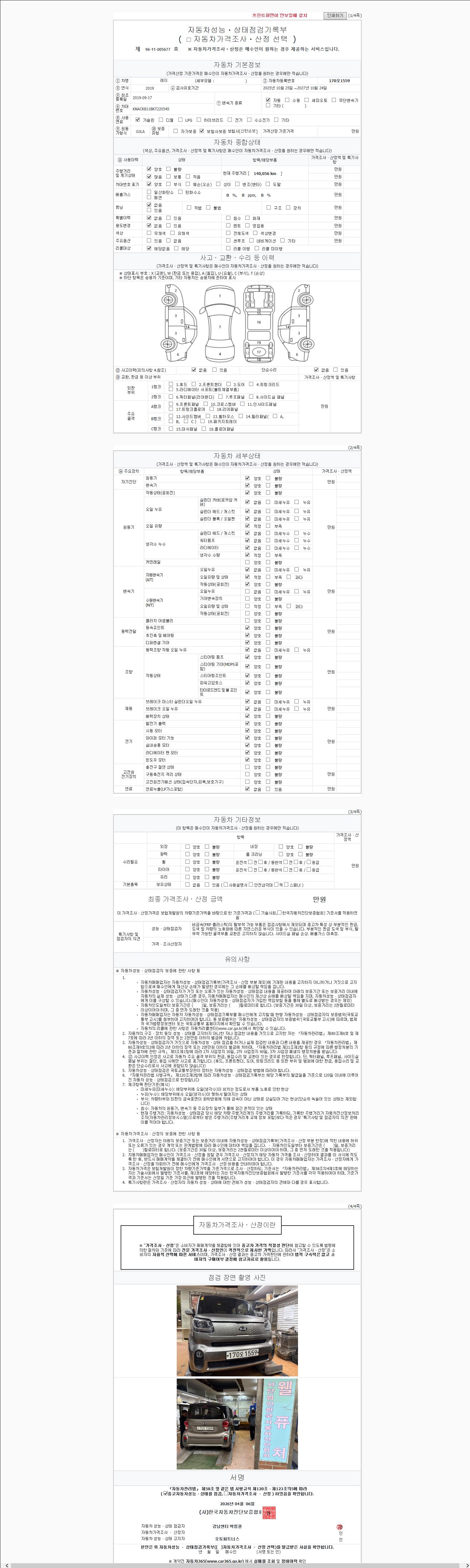 | 주행거리 | 140,056 km | 차량번호 | 170오1559 | 사고유무 | 성능기록부 참조 | 제시번호 | 제 2026043540 호 |
