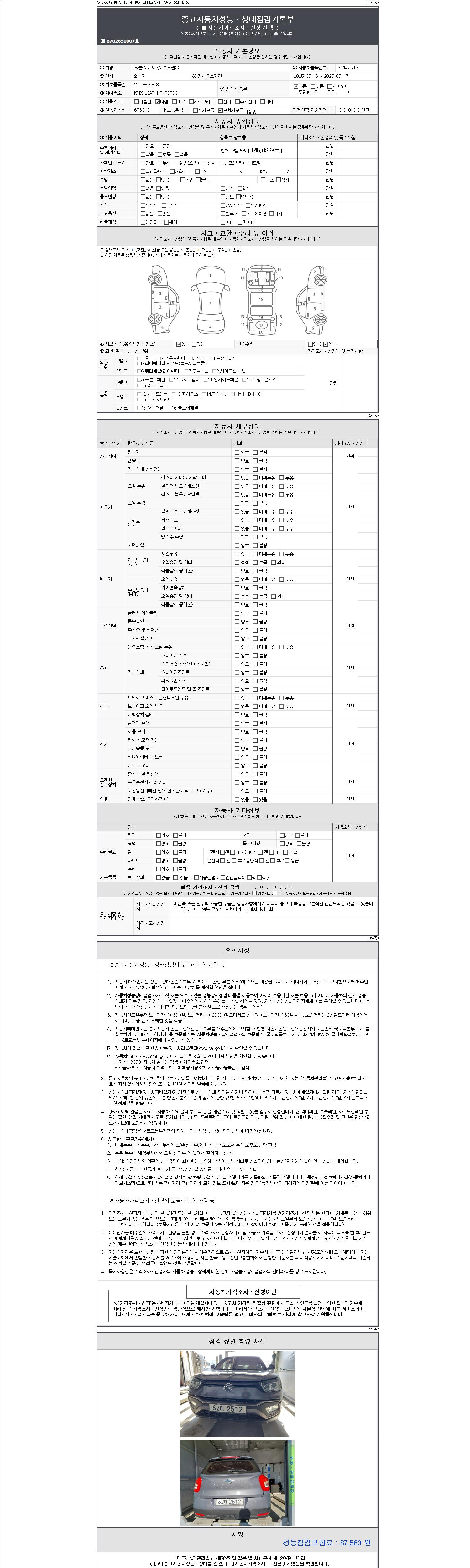 | 주행거리 | 145,082 km | 차량번호 | 62더2512 | 사고유무 | 성능기록부 참조 | 제시번호 | 제 2147483647 호 |