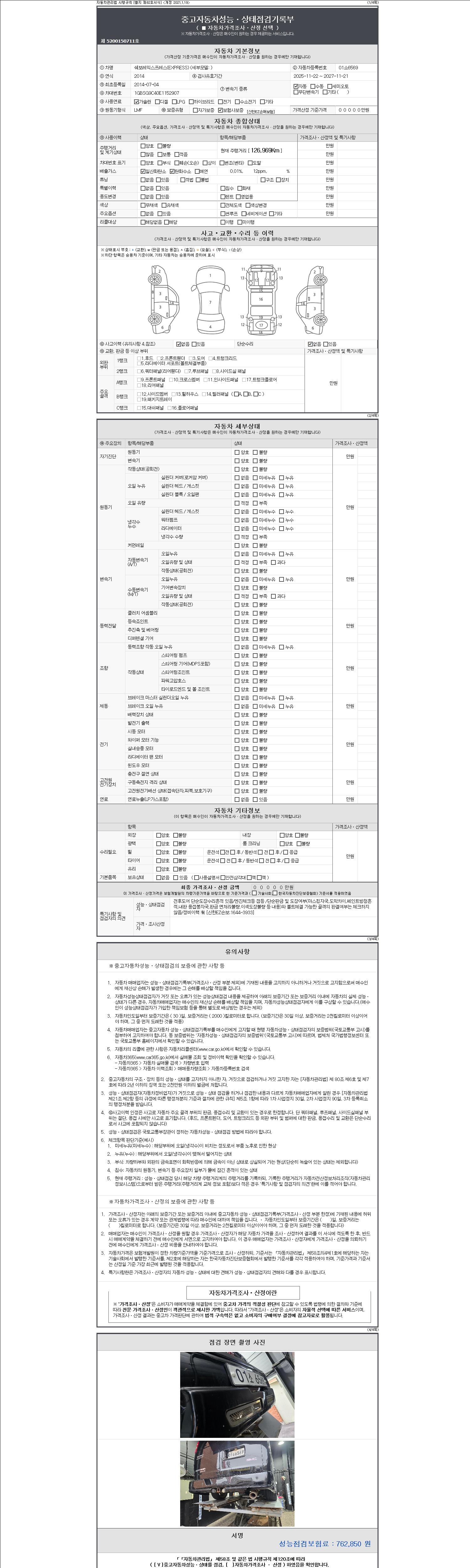 자동차관리법 시행규칙 제120조의 규정에 따라 별지 제 82호서식 《중고자동차 성능, 상태점검 기록부》를 발행한 성능, 상태점검자 및 매매자는 아래의 보증기간 또는 보증거리 이내의 중고자동차, 성능점검 기록부에 기재된 내용과 자동차의 실제 성능, 상태가 다른 경우 계약 또는 관계법령에 따라 매수인에 대하여 책임을 집니다.