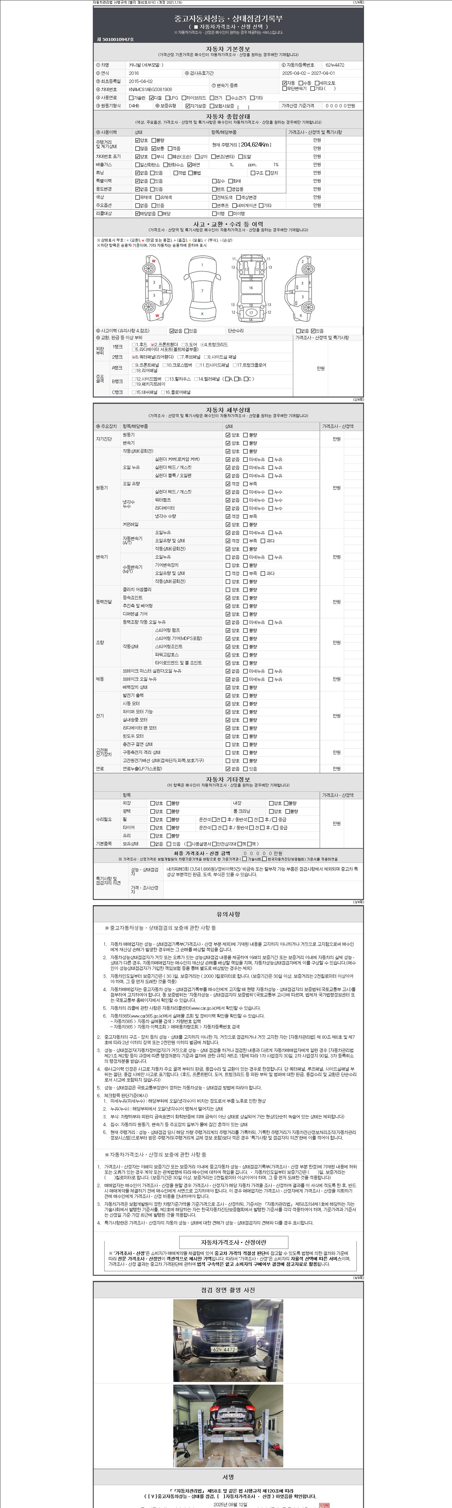 자동차관리법 시행규칙 제120조의 규정에 따라 별지 제 82호서식 《중고자동차 성능, 상태점검 기록부》를 발행한 성능, 상태점검자 및 매매자는 아래의 보증기간 또는 보증거리 이내의 중고자동차, 성능점검 기록부에 기재된 내용과 자동차의 실제 성능, 상태가 다른 경우 계약 또는 관계법령에 따라 매수인에 대하여 책임을 집니다.
