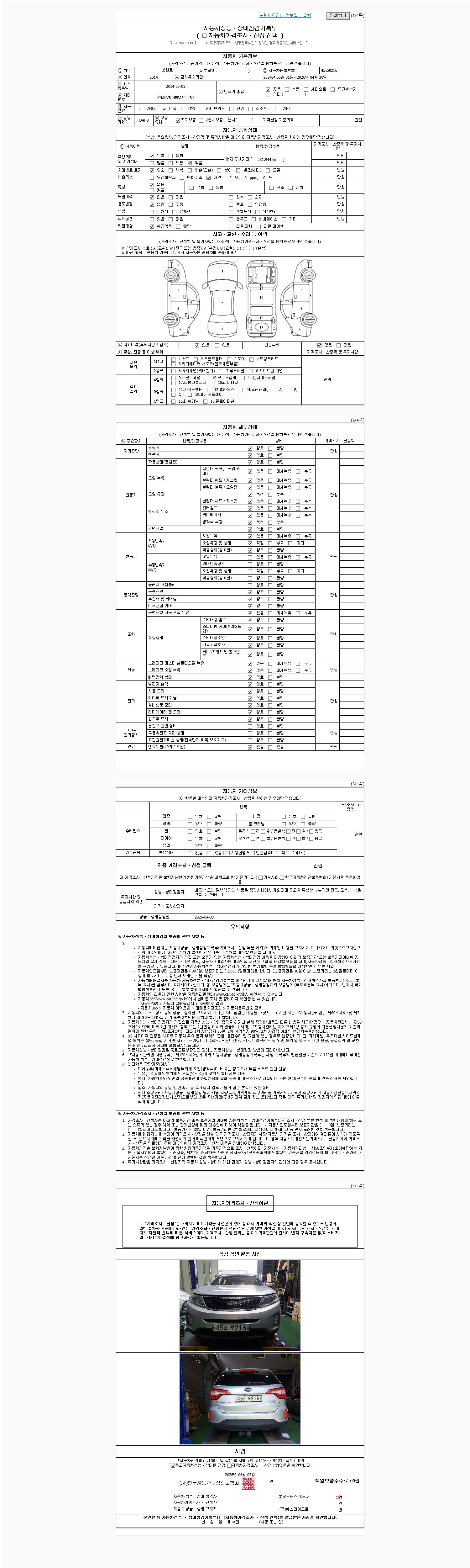 | 주행거리 | 210,000 km | 차량번호 | 45소9216 | 사고유무 | 성능기록부 참조 | 제시번호 | 제 2026050449 호 |