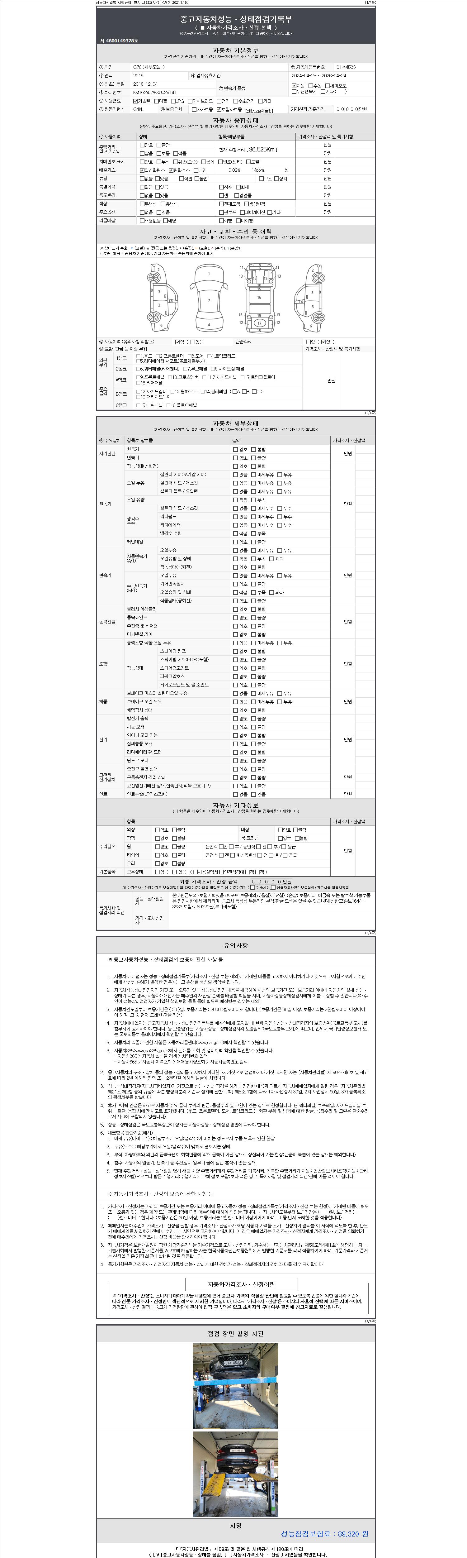 자동차관리법 시행규칙 제120조의 규정에 따라 별지 제 82호서식 《중고자동차 성능, 상태점검 기록부》를 발행한 성능, 상태점검자 및 매매자는 아래의 보증기간 또는 보증거리 이내의 중고자동차, 성능점검 기록부에 기재된 내용과 자동차의 실제 성능, 상태가 다른 경우 계약 또는 관계법령에 따라 매수인에 대하여 책임을 집니다.