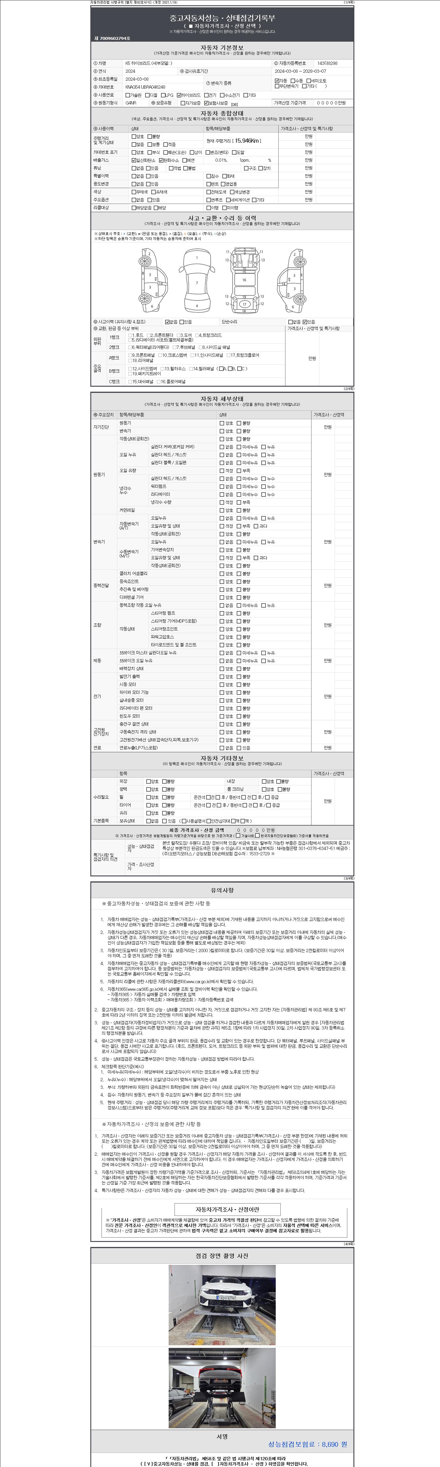 자동차관리법 시행규칙 제120조의 규정에 따라 별지 제 82호서식 《중고자동차 성능, 상태점검 기록부》를 발행한 성능, 상태점검자 및 매매자는 아래의 보증기간 또는 보증거리 이내의 중고자동차, 성능점검 기록부에 기재된 내용과 자동차의 실제 성능, 상태가 다른 경우 계약 또는 관계법령에 따라 매수인에 대하여 책임을 집니다.