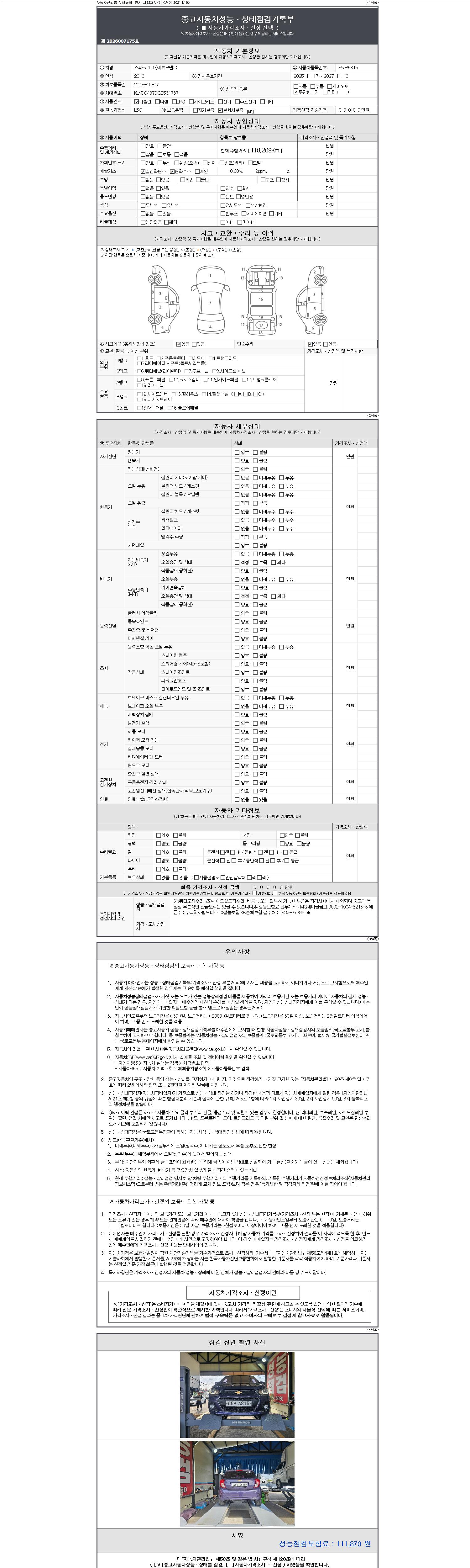 자동차관리법 시행규칙 제120조의 규정에 따라 별지 제 82호서식 《중고자동차 성능, 상태점검 기록부》를 발행한 성능, 상태점검자 및 매매자는 아래의 보증기간 또는 보증거리 이내의 중고자동차, 성능점검 기록부에 기재된 내용과 자동차의 실제 성능, 상태가 다른 경우 계약 또는 관계법령에 따라 매수인에 대하여 책임을 집니다.