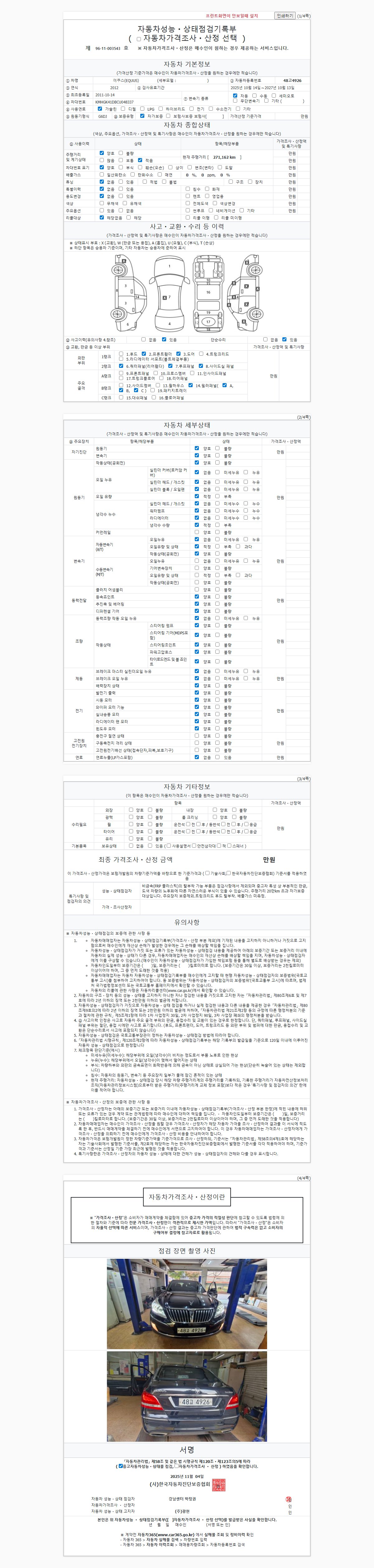 | 주행거리 | 271,162 km | 차량번호 | 48고4926 | 사고유무 | 성능기록부 참조 | 제시번호 | 제 2025148202 호 |