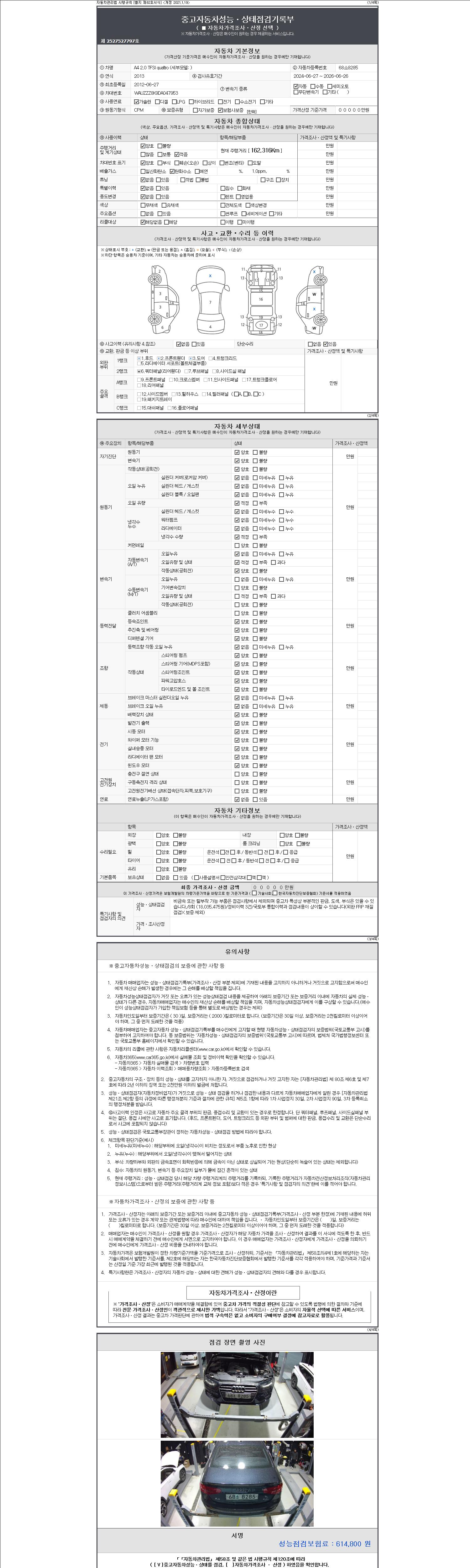 -중고자동차 매매업자를 통해 차량을 구입하실 경우 반드시 "중고자동차 성능, 상태점검 기록부"를 교뷰 받으셔야 하며, 매매업자는 반드시 의무 교부 하여야 압니다.