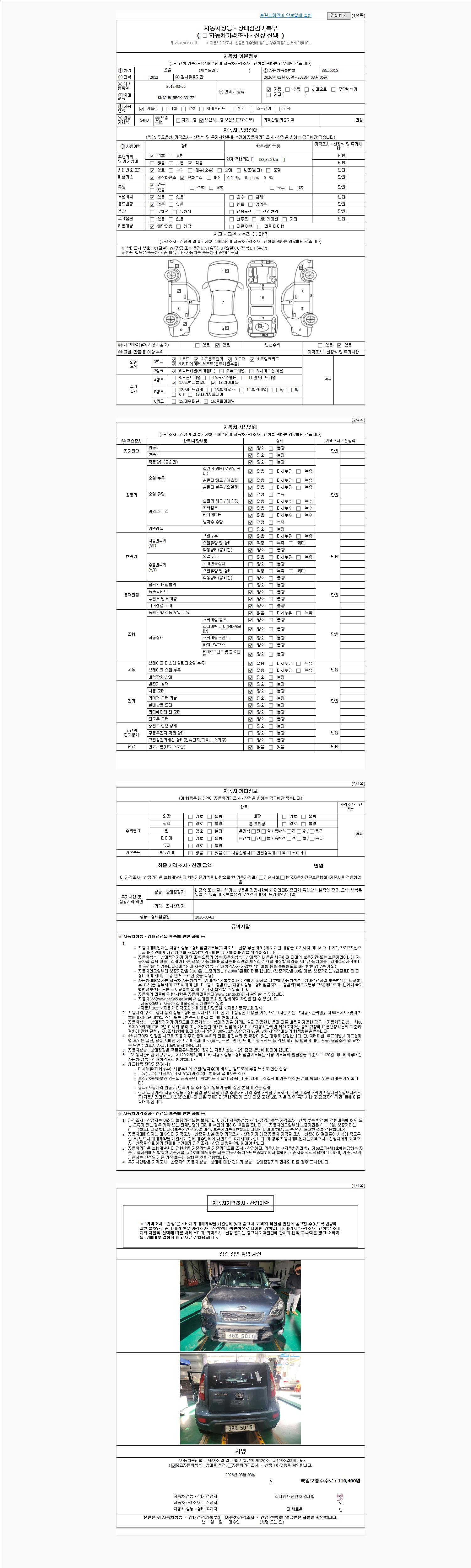 | 주행거리 | 182,320 km | 차량번호 | 38조5015 | 사고유무 | 성능기록부 참조 | 제시번호 | 제 2026010491 호 |