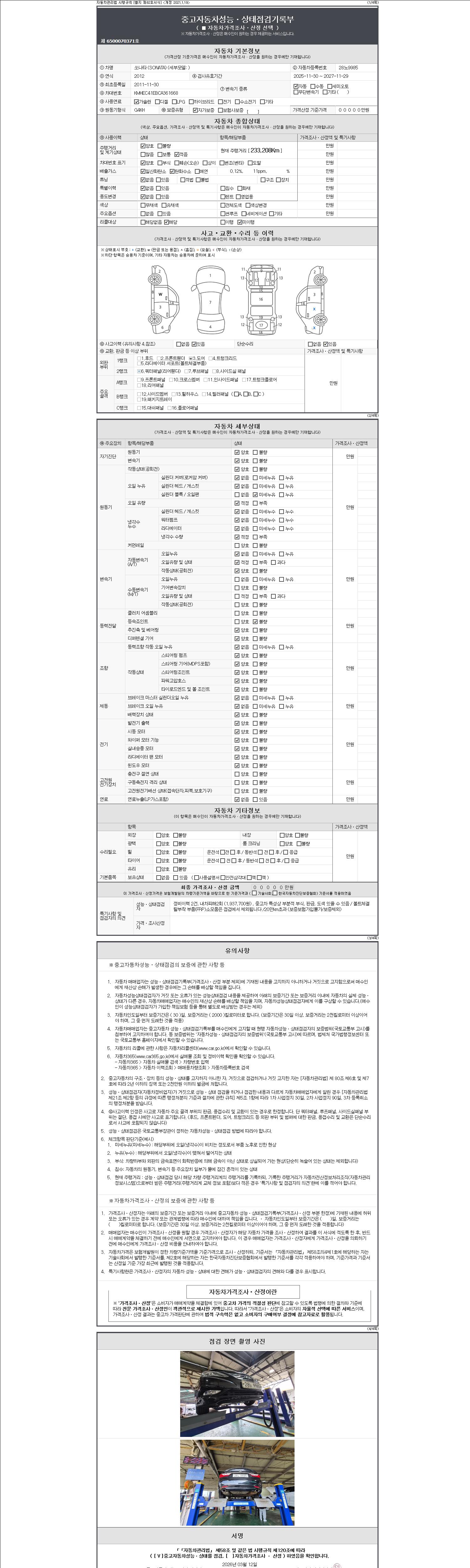 -중고자동차 매매업자를 통해 차량을 구입하실 경우 반드시 "중고자동차 성능, 상태점검 기록부"를 교뷰 받으셔야 하며, 매매업자는 반드시 의무 교부 하여야 압니다.