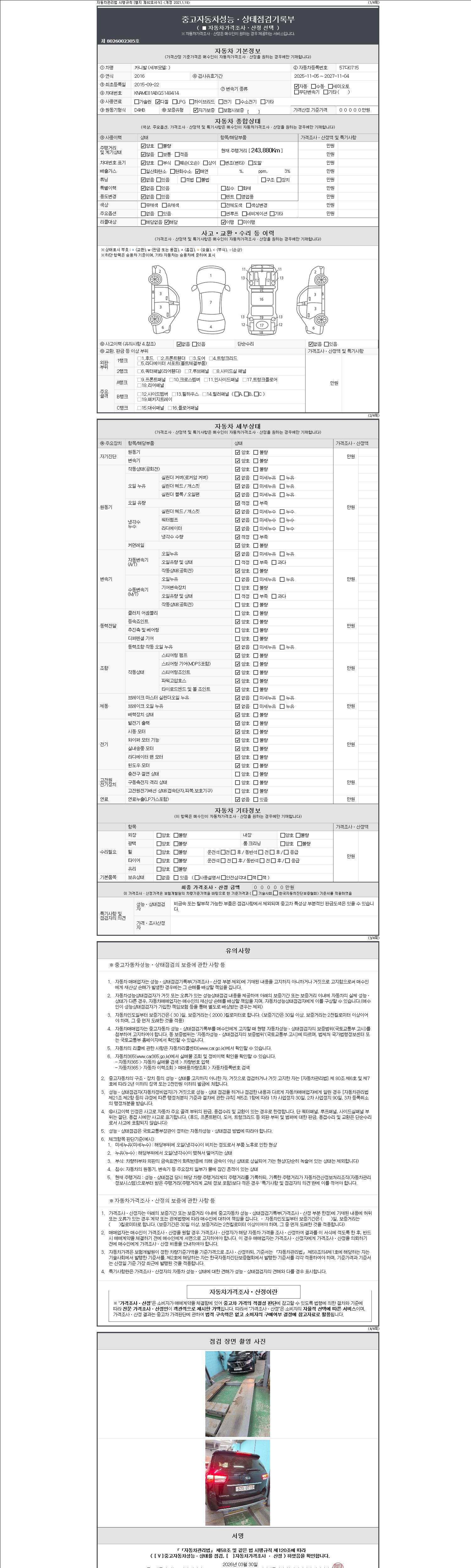 자동차관리법 시행규칙 제120조의 규정에 따라 별지 제 82호서식 《중고자동차 성능, 상태점검 기록부》를 발행한 성능, 상태점검자 및 매매자는 아래의 보증기간 또는 보증거리 이내의 중고자동차, 성능점검 기록부에 기재된 내용과 자동차의 실제 성능, 상태가 다른 경우 계약 또는 관계법령에 따라 매수인에 대하여 책임을 집니다.