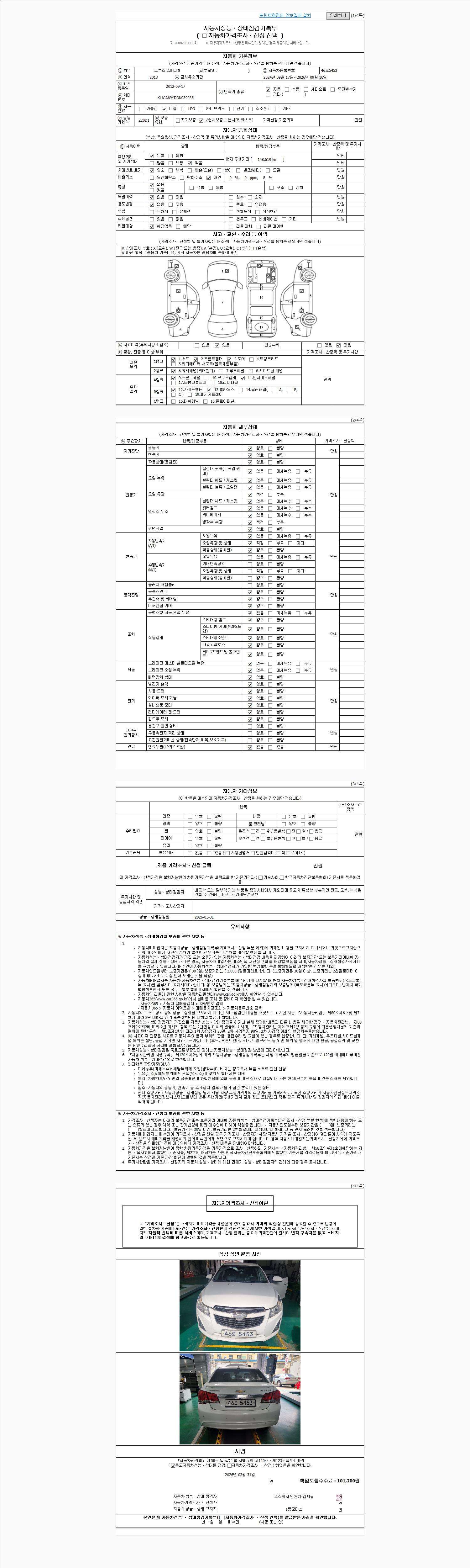 | 주행거리 | 148,619 km | 차량번호 | 46로5453 | 사고유무 | 성능기록부 참조 | 제시번호 | 제 2026016596 호 |