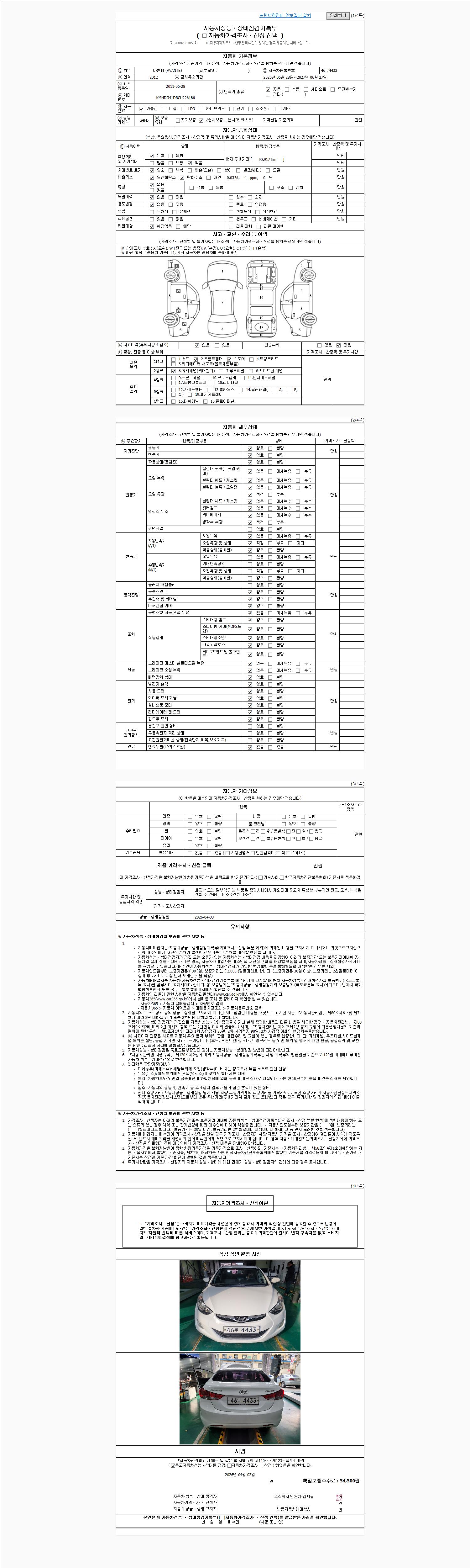 | 주행거리 | 90,917 km | 차량번호 | 46무4433 | 사고유무 | 성능기록부 참조 | 제시번호 | 제 2026016945 호 |
