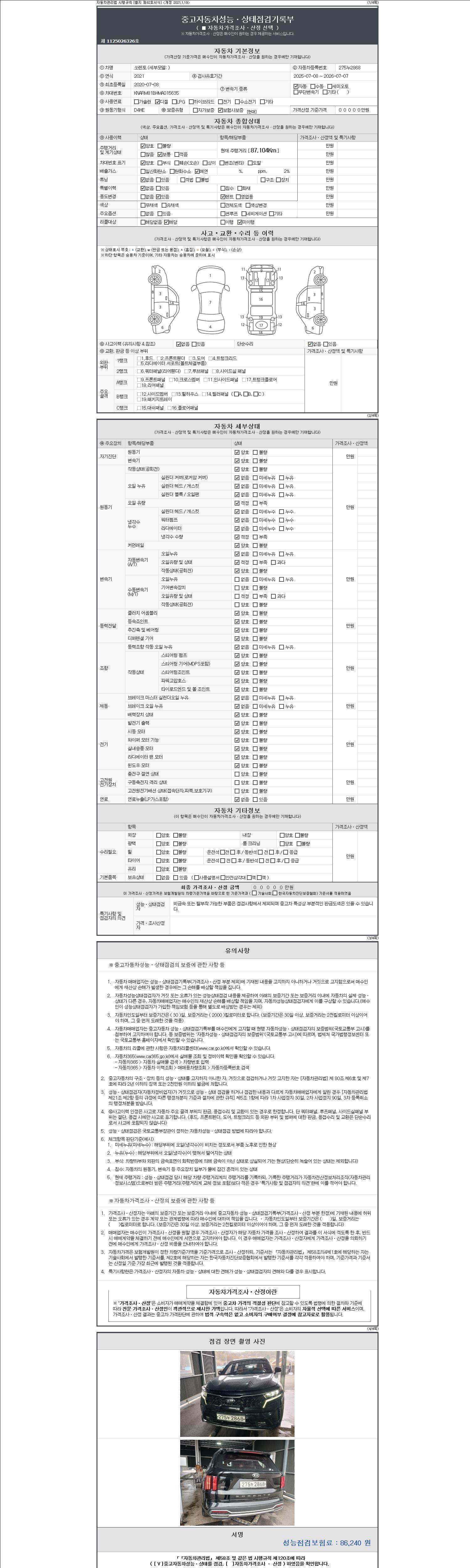 | 주행거리 | 87,104 km | 차량번호 | 275누2868 | 사고유무 | 성능기록부 참조 | 제시번호 | 제 2147483647 호 |