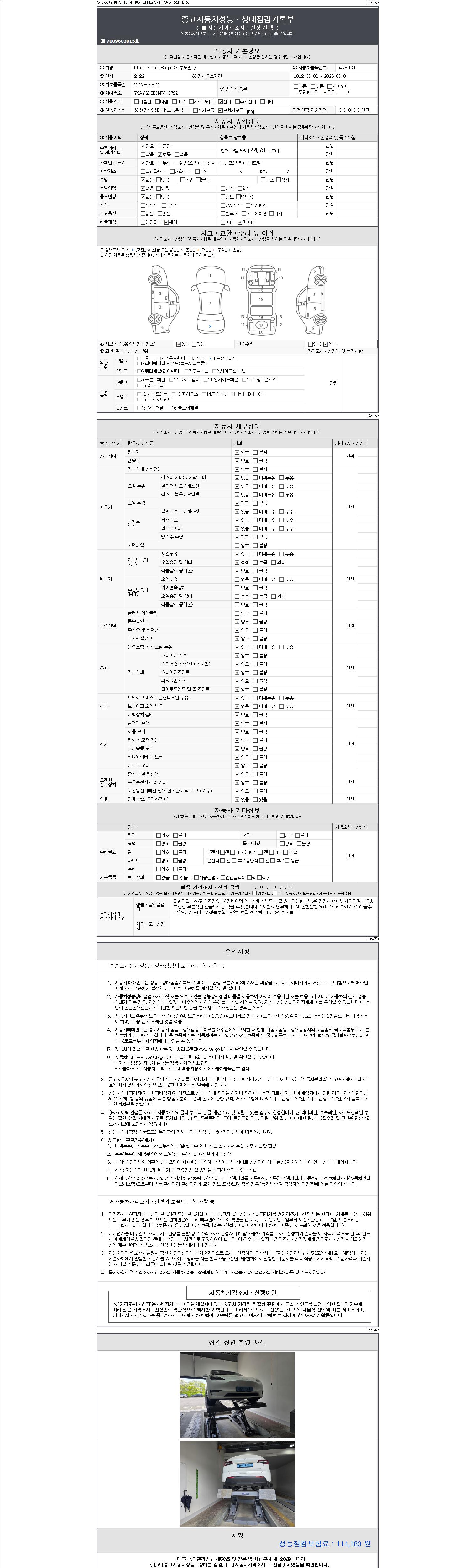 자동차관리법 시행규칙 제120조의 규정에 따라 별지 제 82호서식 《중고자동차 성능, 상태점검 기록부》를 발행한 성능, 상태점검자 및 매매자는 아래의 보증기간 또는 보증거리 이내의 중고자동차, 성능점검 기록부에 기재된 내용과 자동차의 실제 성능, 상태가 다른 경우 계약 또는 관계법령에 따라 매수인에 대하여 책임을 집니다.