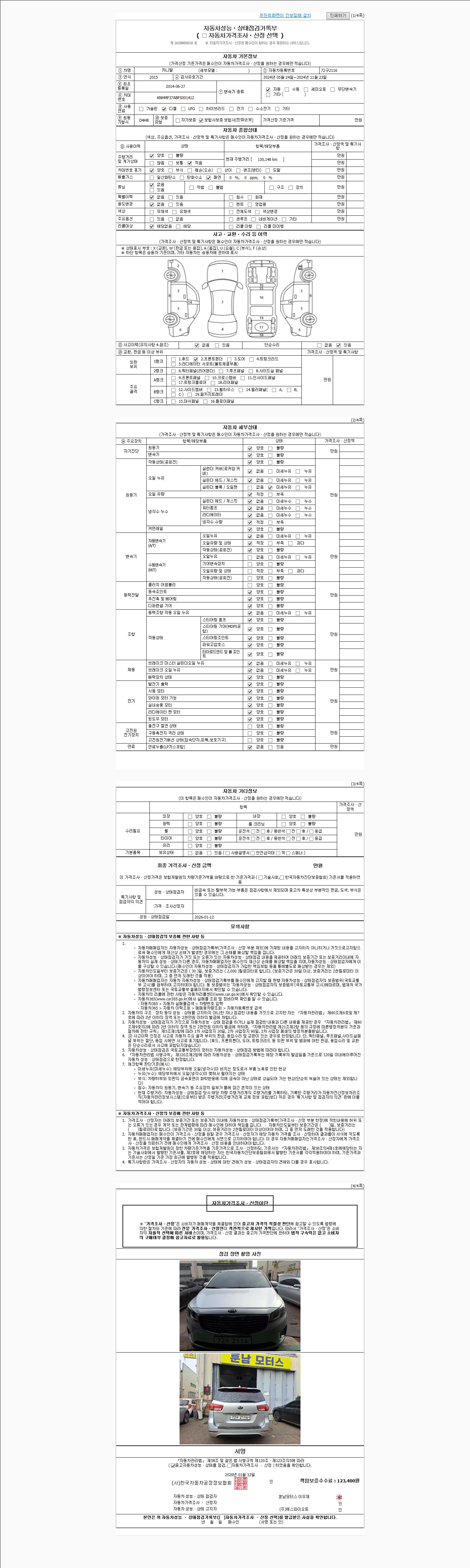 -중고자동차 매매업자를 통해 차량을 구입하실 경우 반드시 "중고자동차 성능, 상태점검 기록부"를 교뷰 받으셔야 하며, 매매업자는 반드시 의무 교부 하여야 압니다.