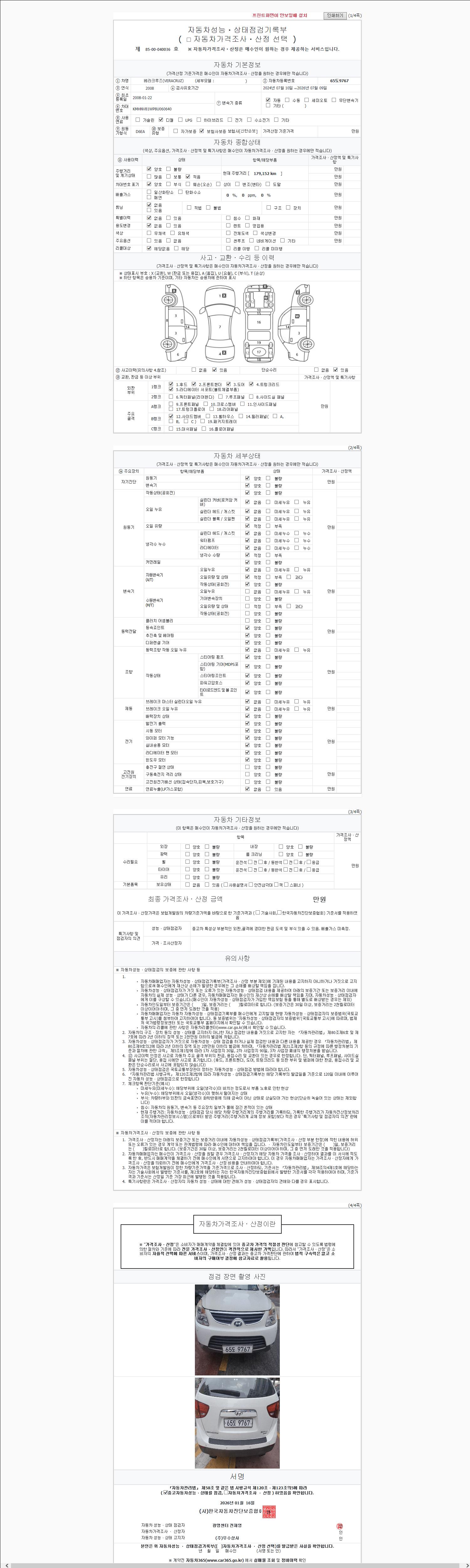 | 주행거리 | 179,152 km | 차량번호 | 65도9767 | 사고유무 | 성능기록부 참조 | 제시번호 | 제 2147483647 호 |
