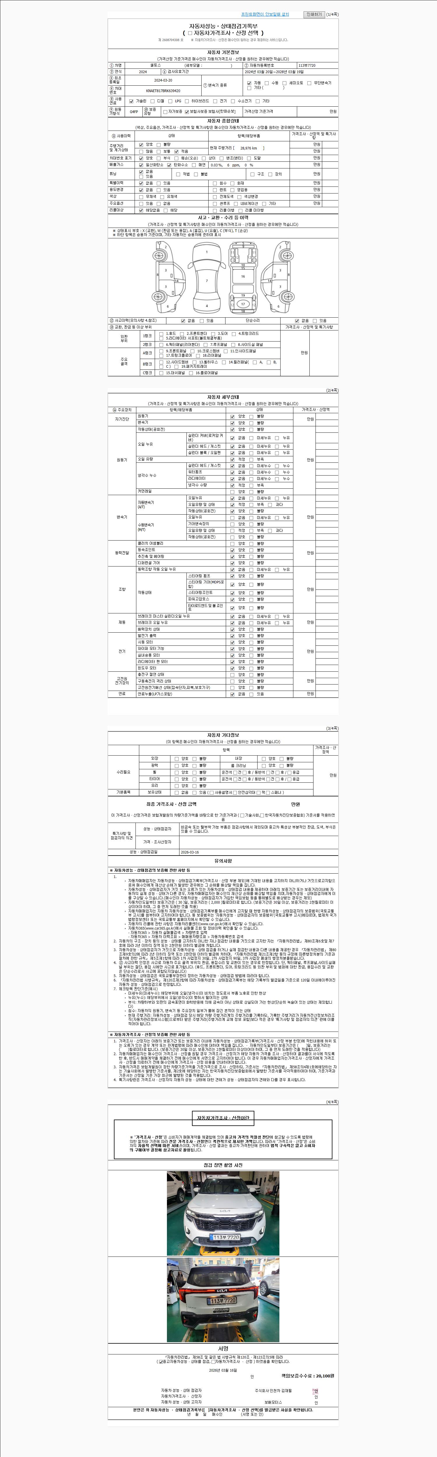 자동차관리법 시행규칙 제120조의 규정에 따라 별지 제 82호서식 《중고자동차 성능, 상태점검 기록부》를 발행한 성능, 상태점검자 및 매매자는 아래의 보증기간 또는 보증거리 이내의 중고자동차, 성능점검 기록부에 기재된 내용과 자동차의 실제 성능, 상태가 다른 경우 계약 또는 관계법령에 따라 매수인에 대하여 책임을 집니다.