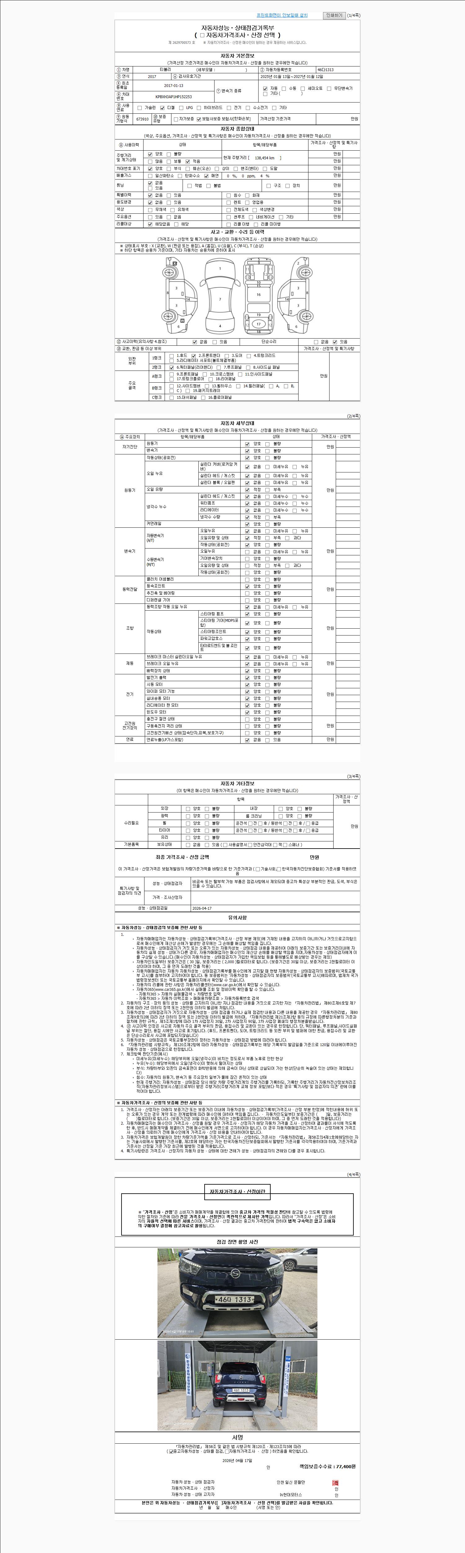 | 주행거리 | 138,454 km | 차량번호 | 46다1313 | 사고유무 | 성능기록부 참조 | 제시번호 | 제 2026018224 호 |