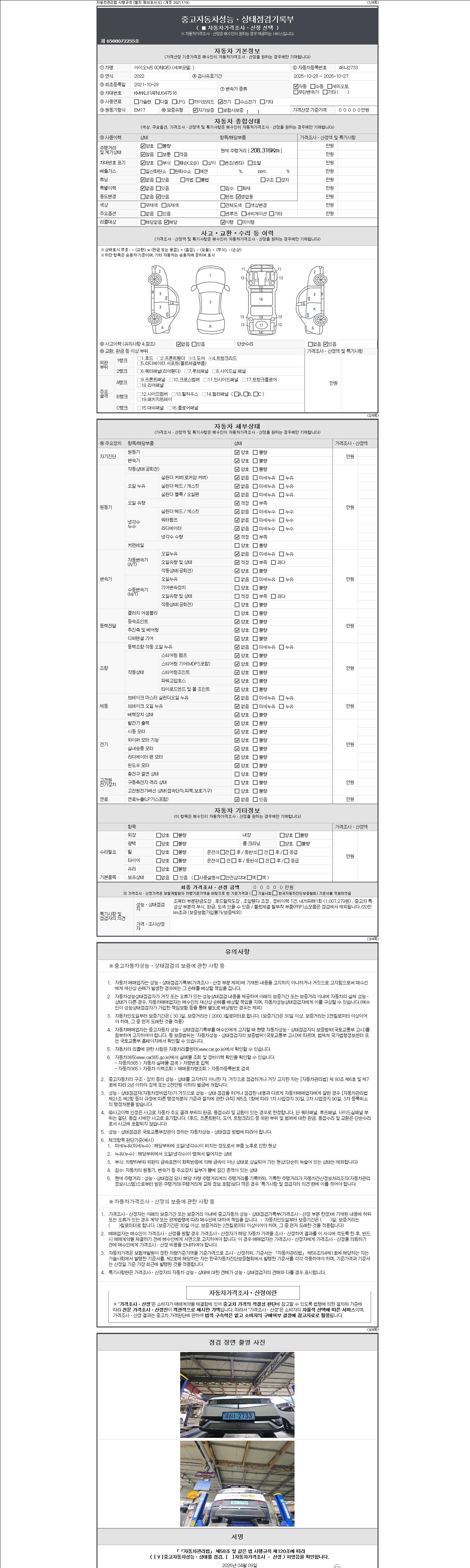 자동차관리법 시행규칙 제120조의 규정에 따라 별지 제 82호서식 《중고자동차 성능, 상태점검 기록부》를 발행한 성능, 상태점검자 및 매매자는 아래의 보증기간 또는 보증거리 이내의 중고자동차, 성능점검 기록부에 기재된 내용과 자동차의 실제 성능, 상태가 다른 경우 계약 또는 관계법령에 따라 매수인에 대하여 책임을 집니다.