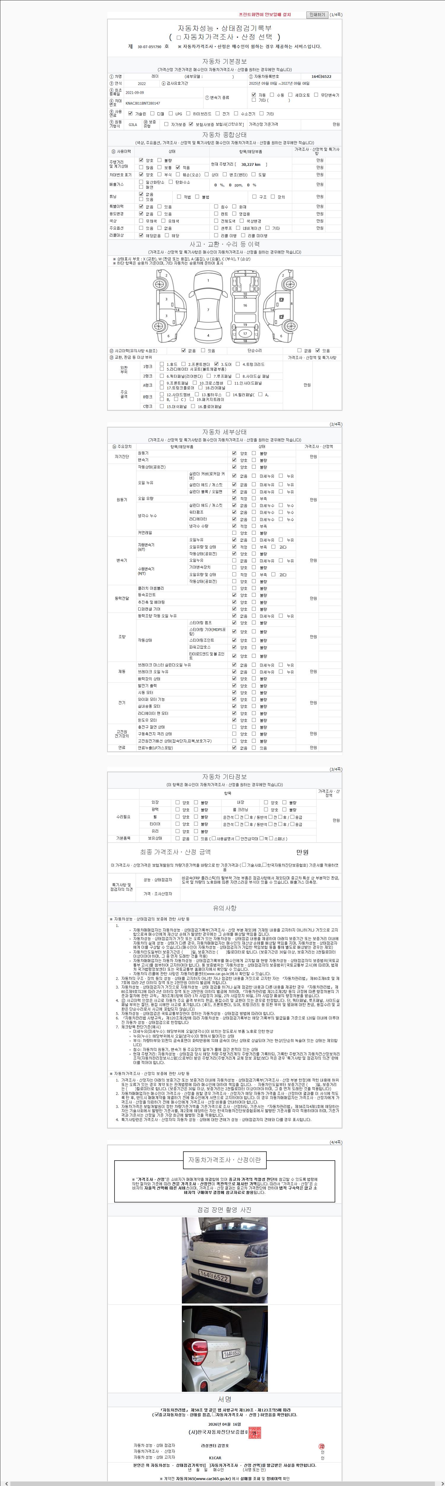 자동차관리법 시행규칙 제120조의 규정에 따라 별지 제 82호서식 《중고자동차 성능, 상태점검 기록부》를 발행한 성능, 상태점검자 및 매매자는 아래의 보증기간 또는 보증거리 이내의 중고자동차, 성능점검 기록부에 기재된 내용과 자동차의 실제 성능, 상태가 다른 경우 계약 또는 관계법령에 따라 매수인에 대하여 책임을 집니다.