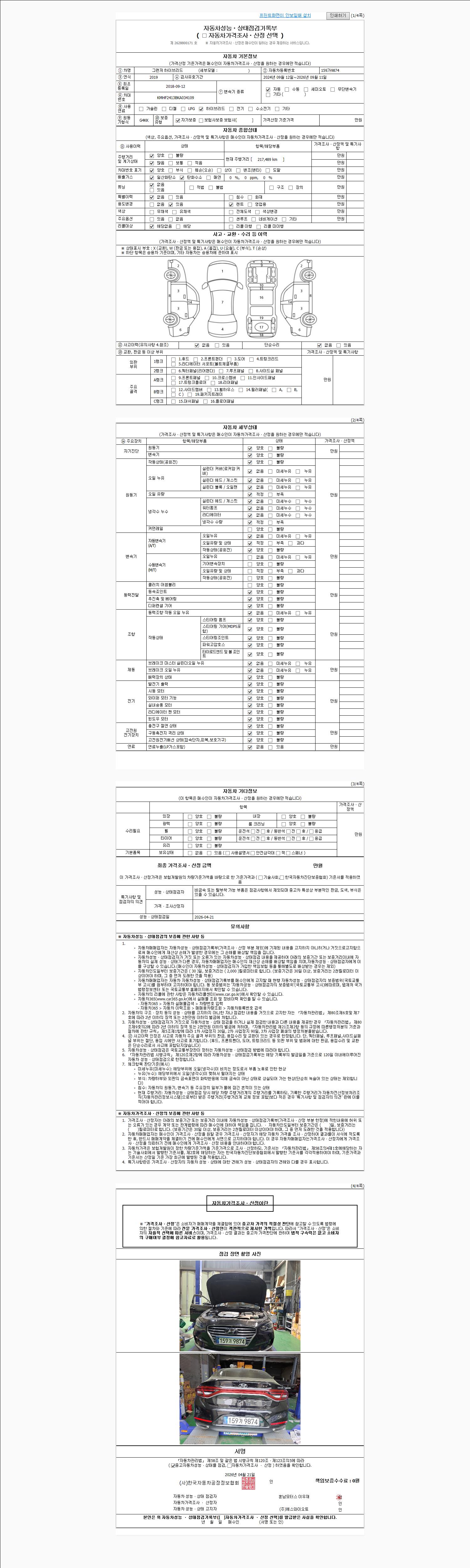 | 주행거리 | 217,000 km | 차량번호 | 159가9874 | 사고유무 | 성능기록부 참조 | 제시번호 | 제 2026060187 호 |