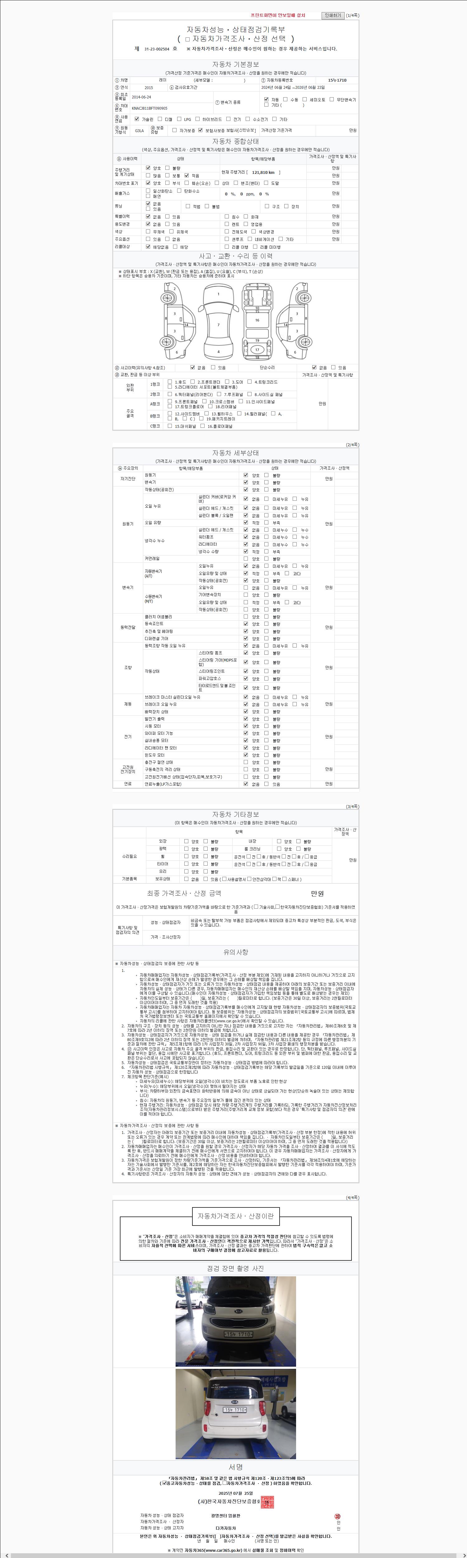| 주행거리 | 121,810 km | 차량번호 | 15누1710 | 사고유무 | 성능기록부 참조 | 제시번호 | 제 2147483647 호 |