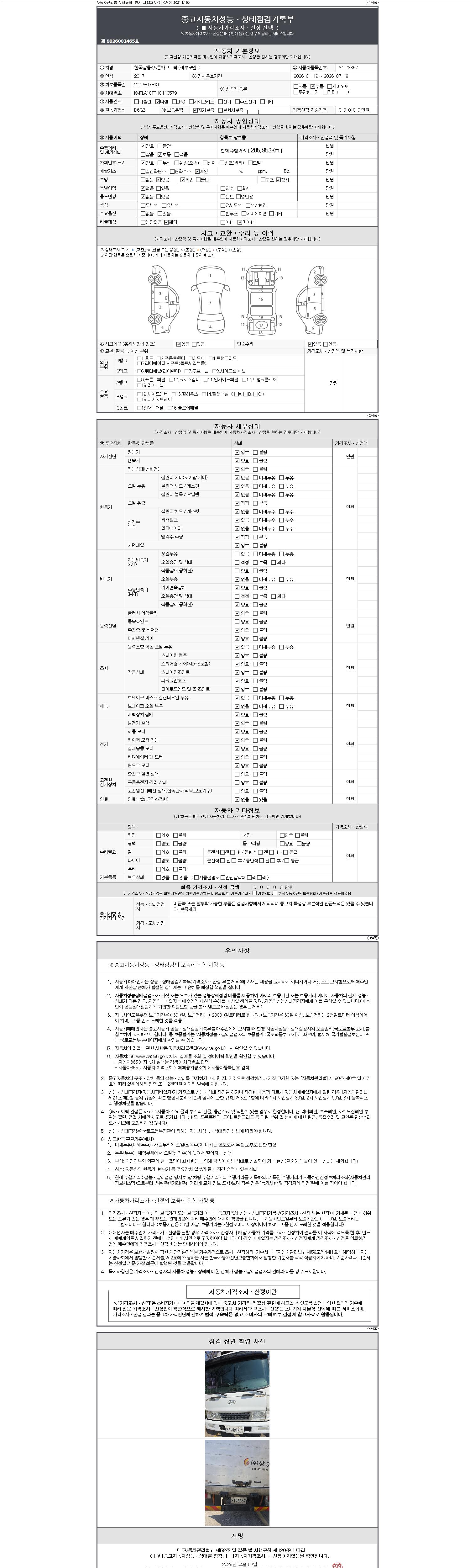 자동차관리법 시행규칙 제120조의 규정에 따라 별지 제 82호서식 《중고자동차 성능, 상태점검 기록부》를 발행한 성능, 상태점검자 및 매매자는 아래의 보증기간 또는 보증거리 이내의 중고자동차, 성능점검 기록부에 기재된 내용과 자동차의 실제 성능, 상태가 다른 경우 계약 또는 관계법령에 따라 매수인에 대하여 책임을 집니다.