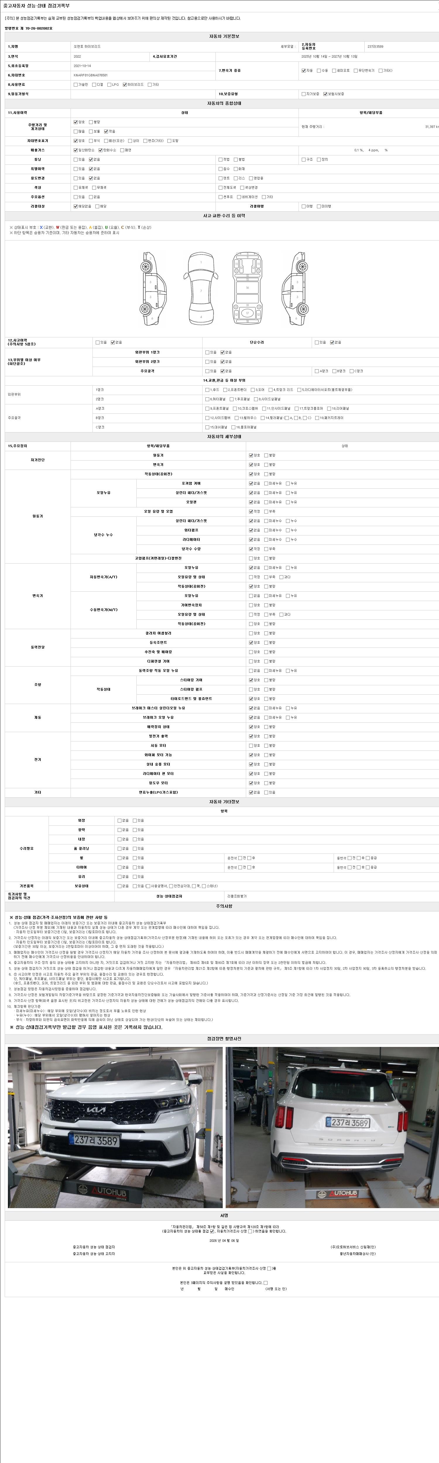 자동차관리법 시행규칙 제120조의 규정에 따라 별지 제 82호서식 《중고자동차 성능, 상태점검 기록부》를 발행한 성능, 상태점검자 및 매매자는 아래의 보증기간 또는 보증거리 이내의 중고자동차, 성능점검 기록부에 기재된 내용과 자동차의 실제 성능, 상태가 다른 경우 계약 또는 관계법령에 따라 매수인에 대하여 책임을 집니다.