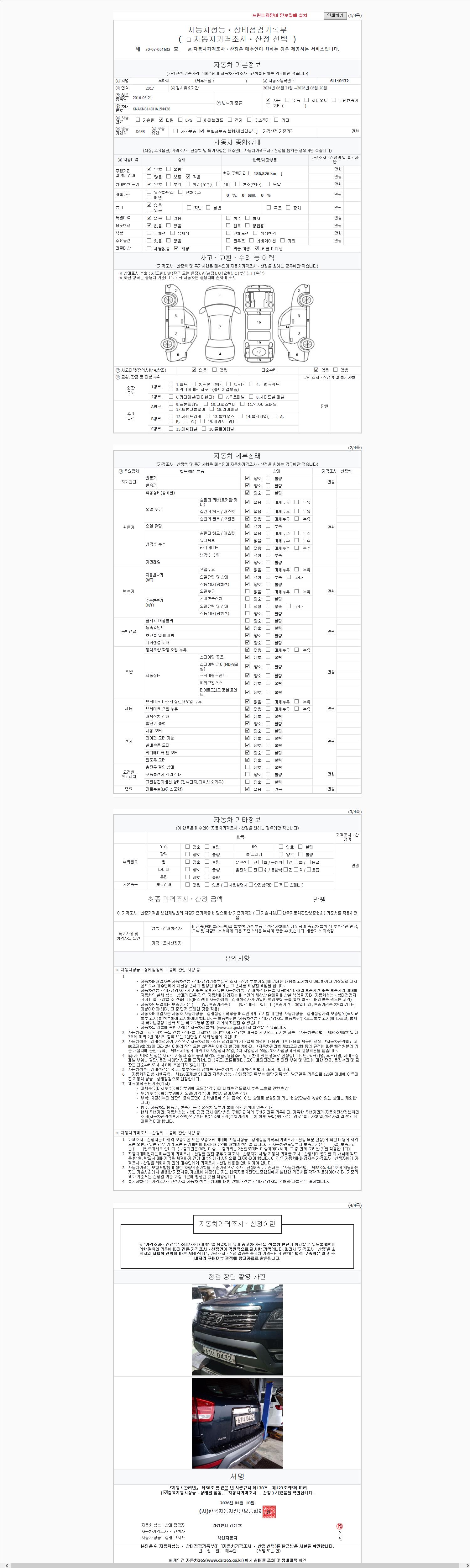 | 주행거리 | 186,195 km | 차량번호 | 61너0432 | 사고유무 | 성능기록부 참조 | 제시번호 | 제 2147483647 호 |