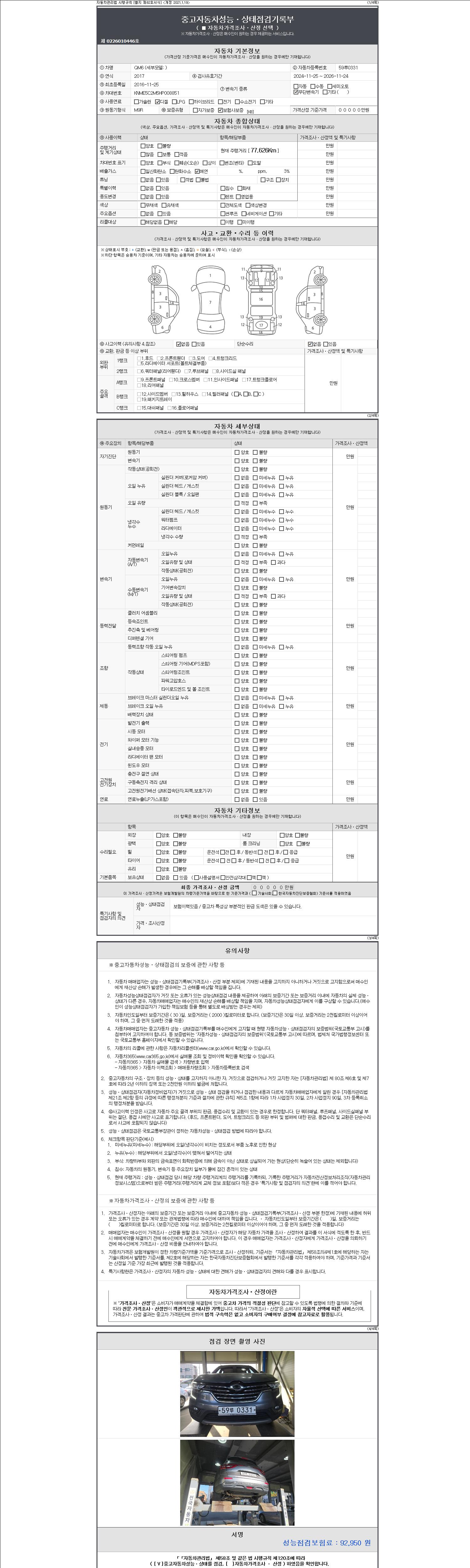 자동차관리법 시행규칙 제120조의 규정에 따라 별지 제 82호서식 《중고자동차 성능, 상태점검 기록부》를 발행한 성능, 상태점검자 및 매매자는 아래의 보증기간 또는 보증거리 이내의 중고자동차, 성능점검 기록부에 기재된 내용과 자동차의 실제 성능, 상태가 다른 경우 계약 또는 관계법령에 따라 매수인에 대하여 책임을 집니다.