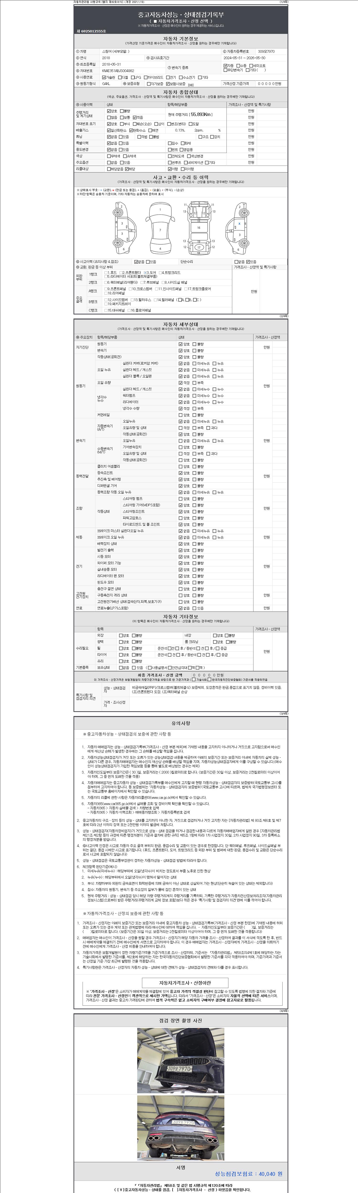 자동차관리법 시행규칙 제120조의 규정에 따라 별지 제 82호서식 《중고자동차 성능, 상태점검 기록부》를 발행한 성능, 상태점검자 및 매매자는 아래의 보증기간 또는 보증거리 이내의 중고자동차, 성능점검 기록부에 기재된 내용과 자동차의 실제 성능, 상태가 다른 경우 계약 또는 관계법령에 따라 매수인에 대하여 책임을 집니다.