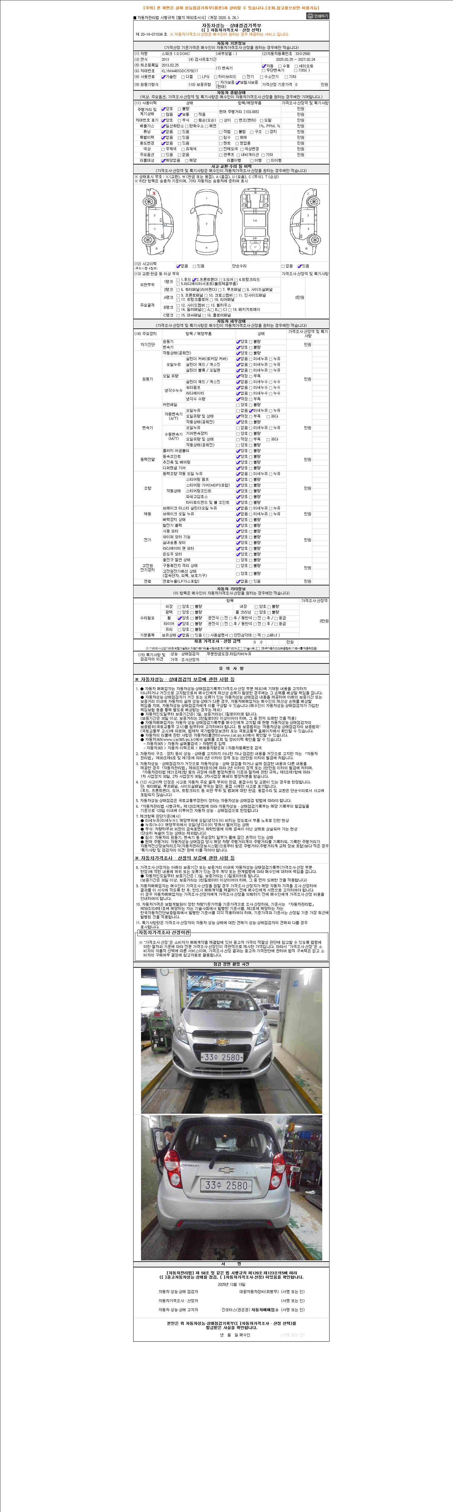 자동차관리법 시행규칙 제120조의 규정에 따라 별지 제 82호서식 《중고자동차 성능, 상태점검 기록부》를 발행한 성능, 상태점검자 및 매매자는 아래의 보증기간 또는 보증거리 이내의 중고자동차, 성능점검 기록부에 기재된 내용과 자동차의 실제 성능, 상태가 다른 경우 계약 또는 관계법령에 따라 매수인에 대하여 책임을 집니다.